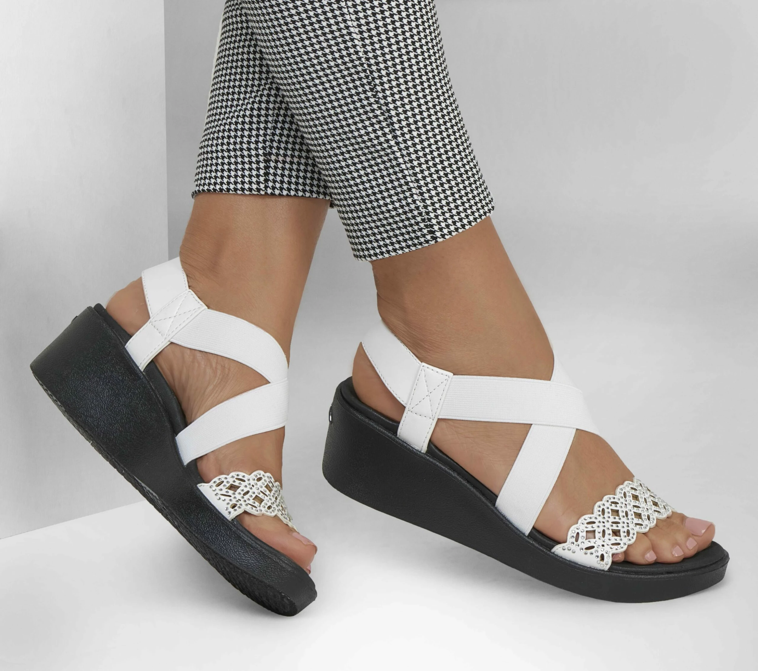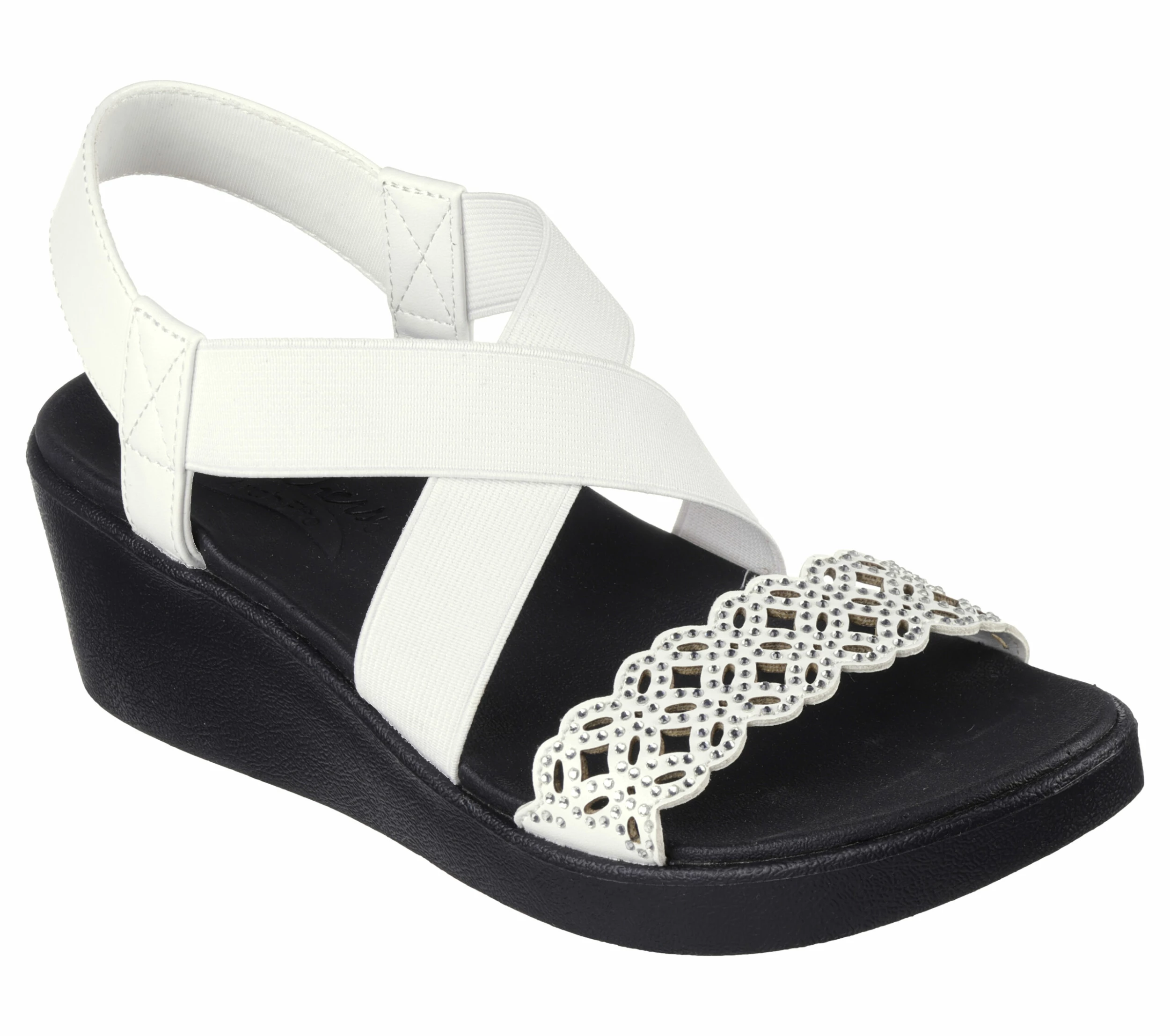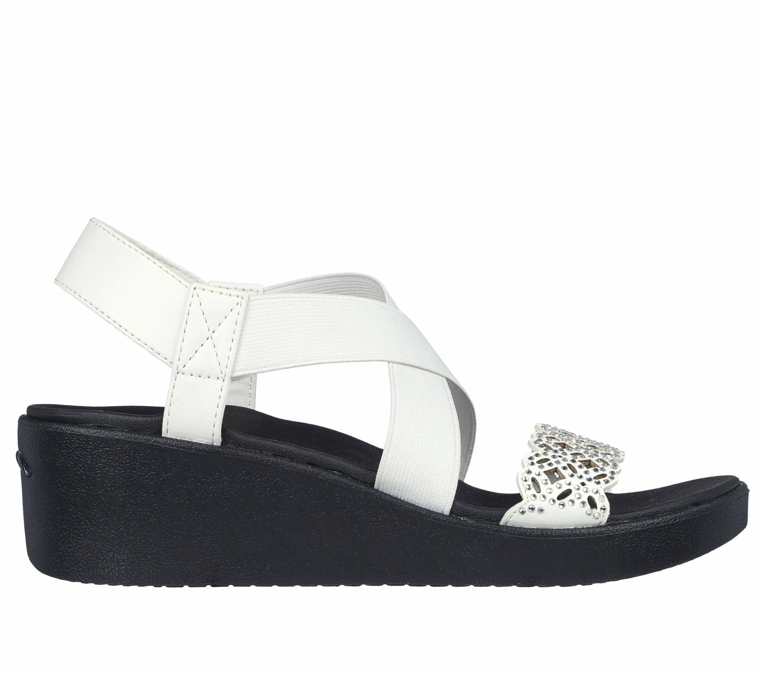 Sunny-weather style and long-lasting comfort combine in Skechers Cali® Arch Fit® Rumble – Dance Party. This sling-back wedge sandal features an embellished synthetic floral laser cut upper with a strappy stretch fabric instep and a supportive Arch Fit® footbed.