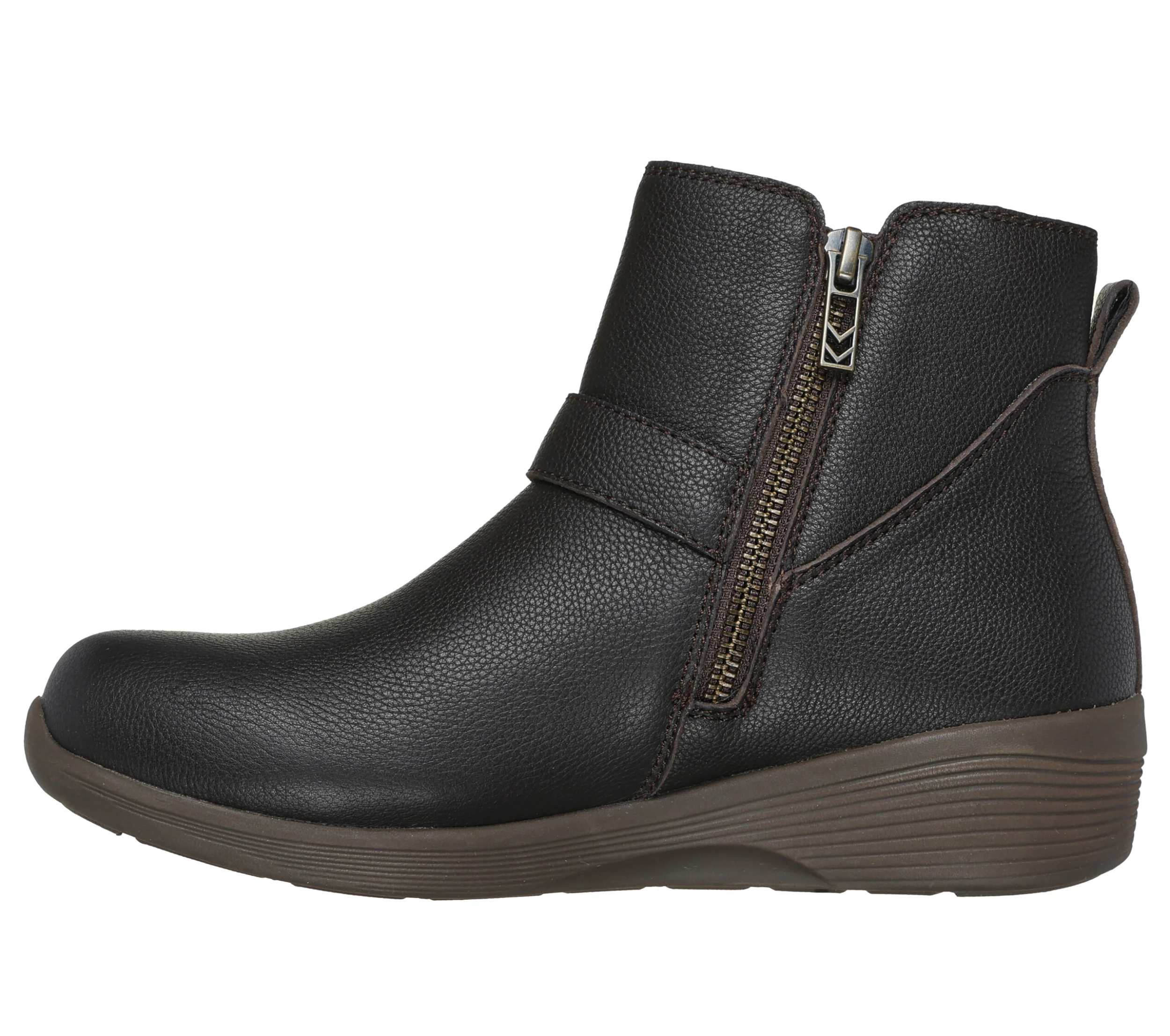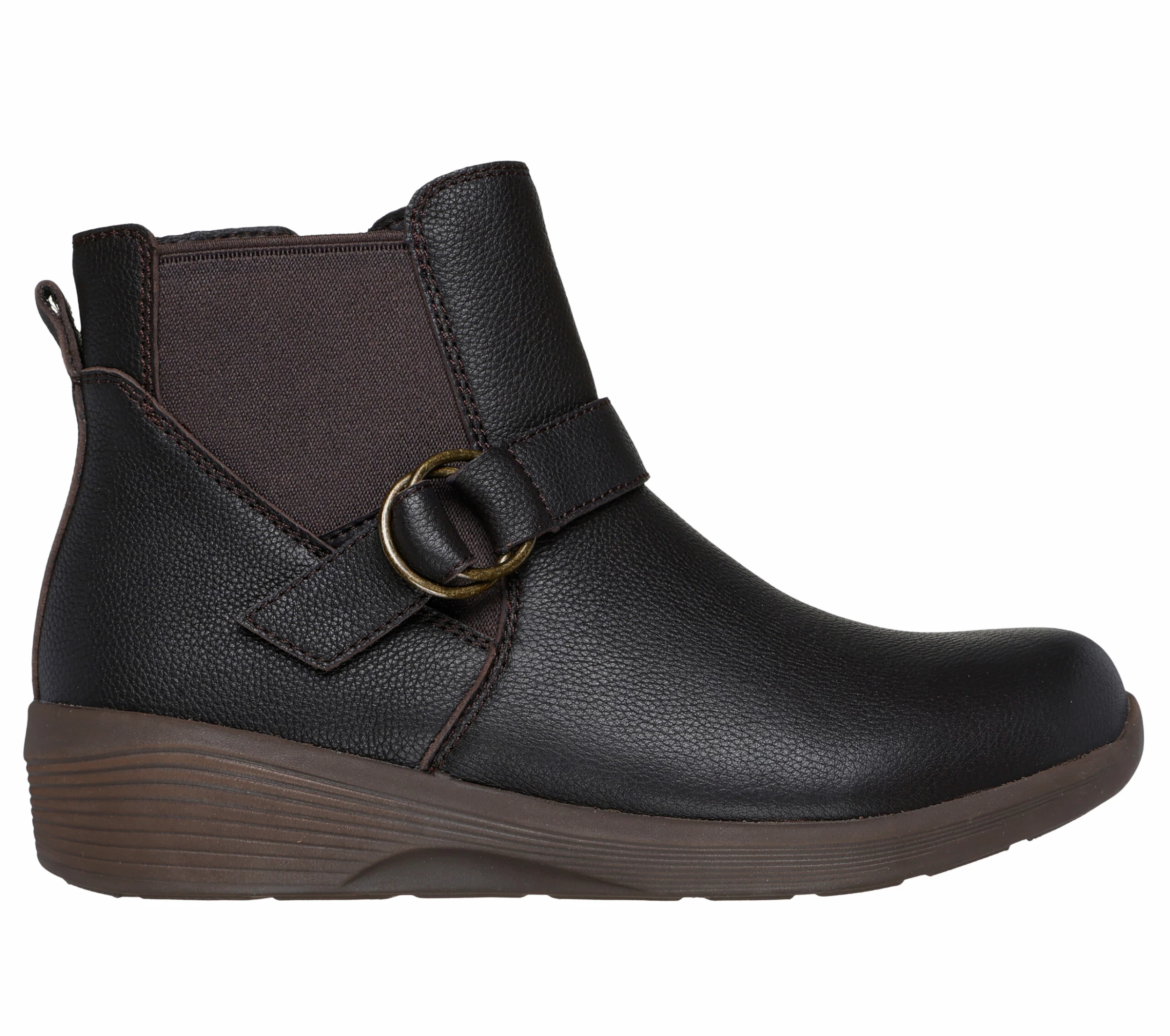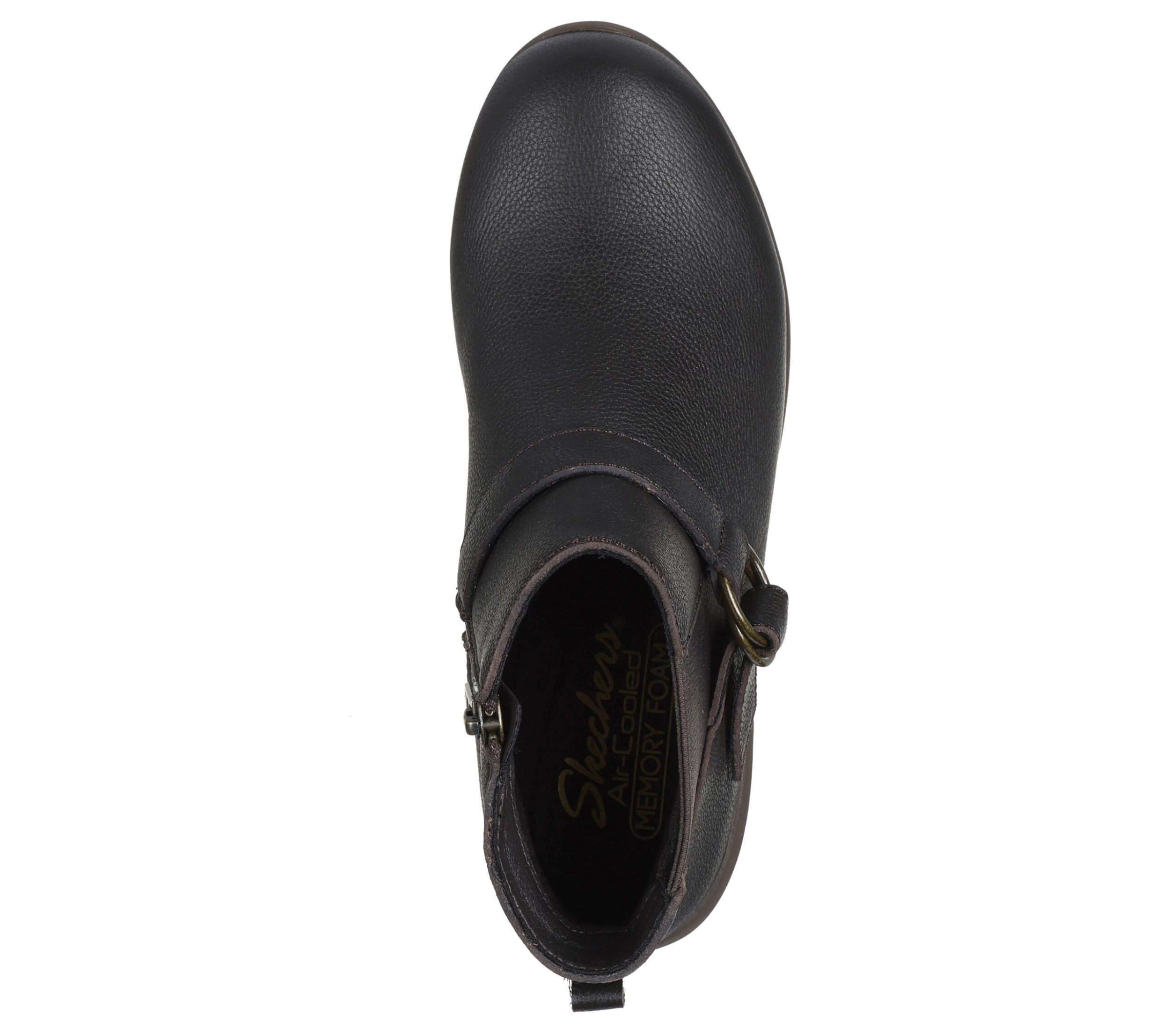 Modern style and chic sensibilities combine in Skechers Arya – Mod Squad. This casual bootie features a leather upper with an O-ring buckle detail, side zip closure and a cushioned Skechers Air-Cooled Memory Foam® comfort insole.