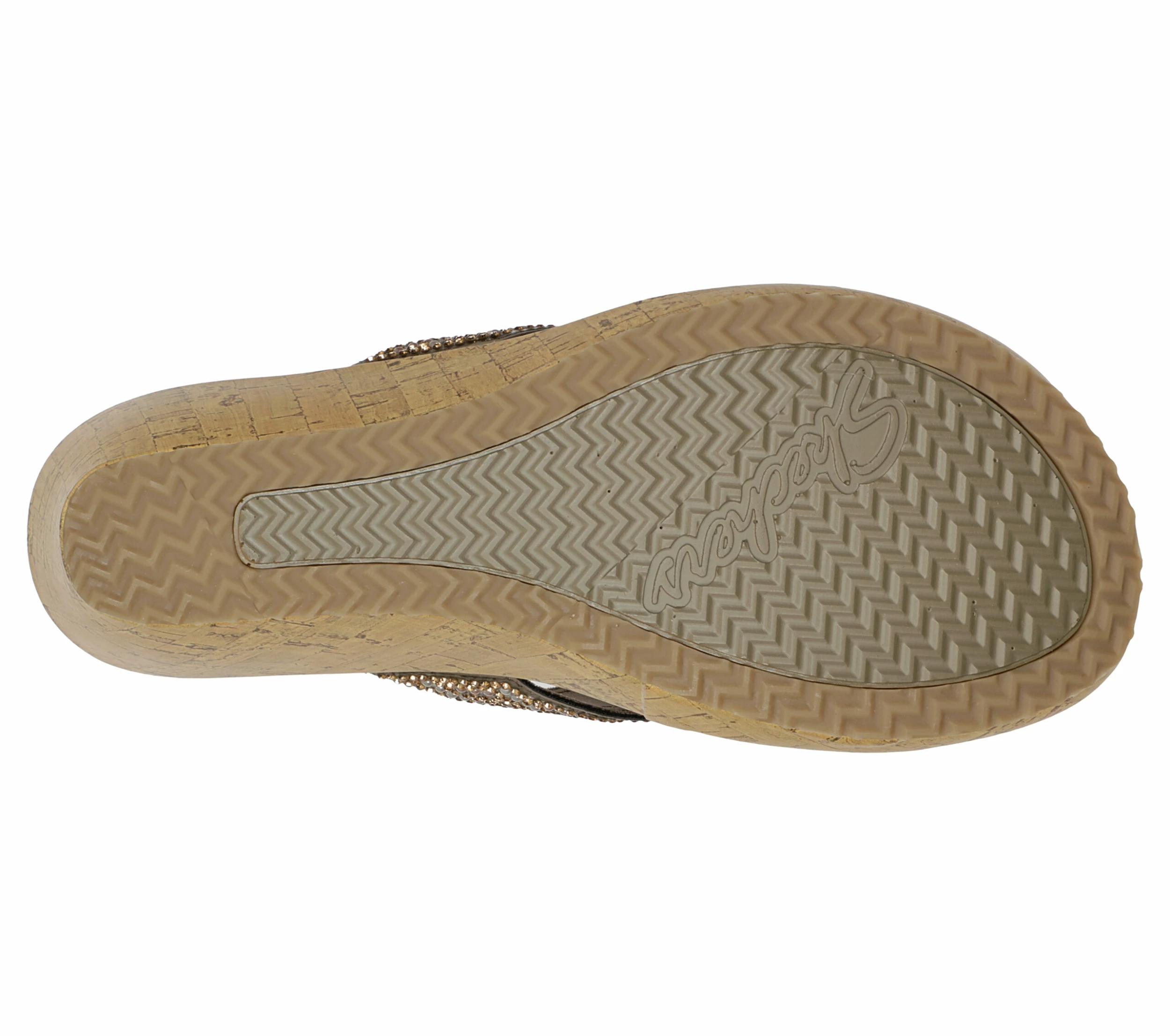 Make a glam statement in stylish comfort wearing Skechers Cali® Beverlee – Charming Pearl. This thong style fashion sandal features a faux-pearl and bead embellished synthetic upper with a cork style wedge midsole and a Luxe Foam® footbed.