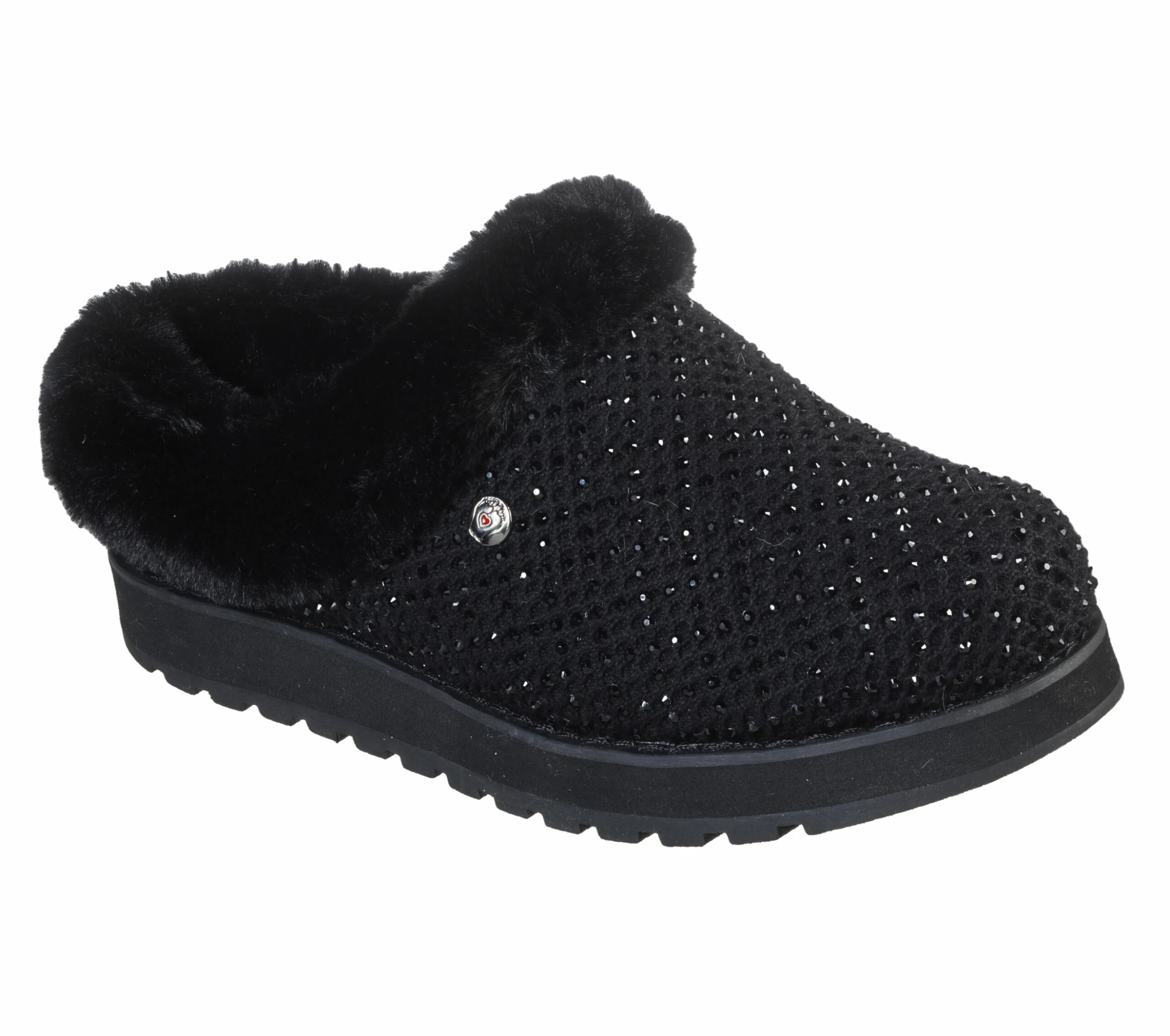 Twinkle like the stars on a clear cool night wearing the SKECHERS BOBS Keepsakes 2.0 shoe. Soft woven sweater knit fabric upper in a slip on casual comfort clog slipper with sparkling mini rhinestone accents, faux fur lining and Memory Foam footbed.