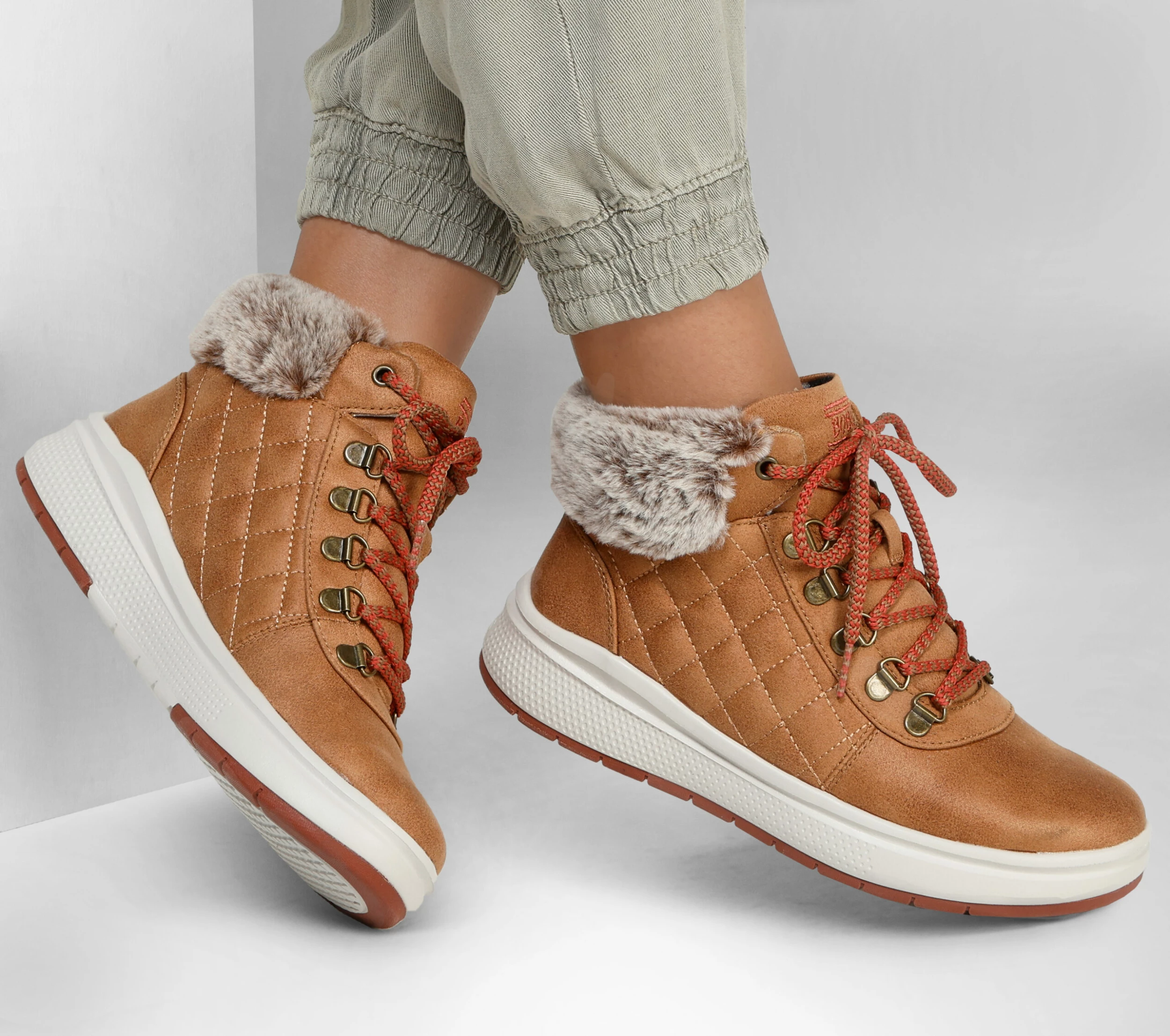 Chic style and plush comfort combine in BOBS from Skechers Skipper Wave – Grand Leap. This casual lace-up bootie features a synthetic leather fabric upper with a faux-fur collar and Skechers Memory Foam insole. For every BOBS purchase, a donation is made to animals in need.