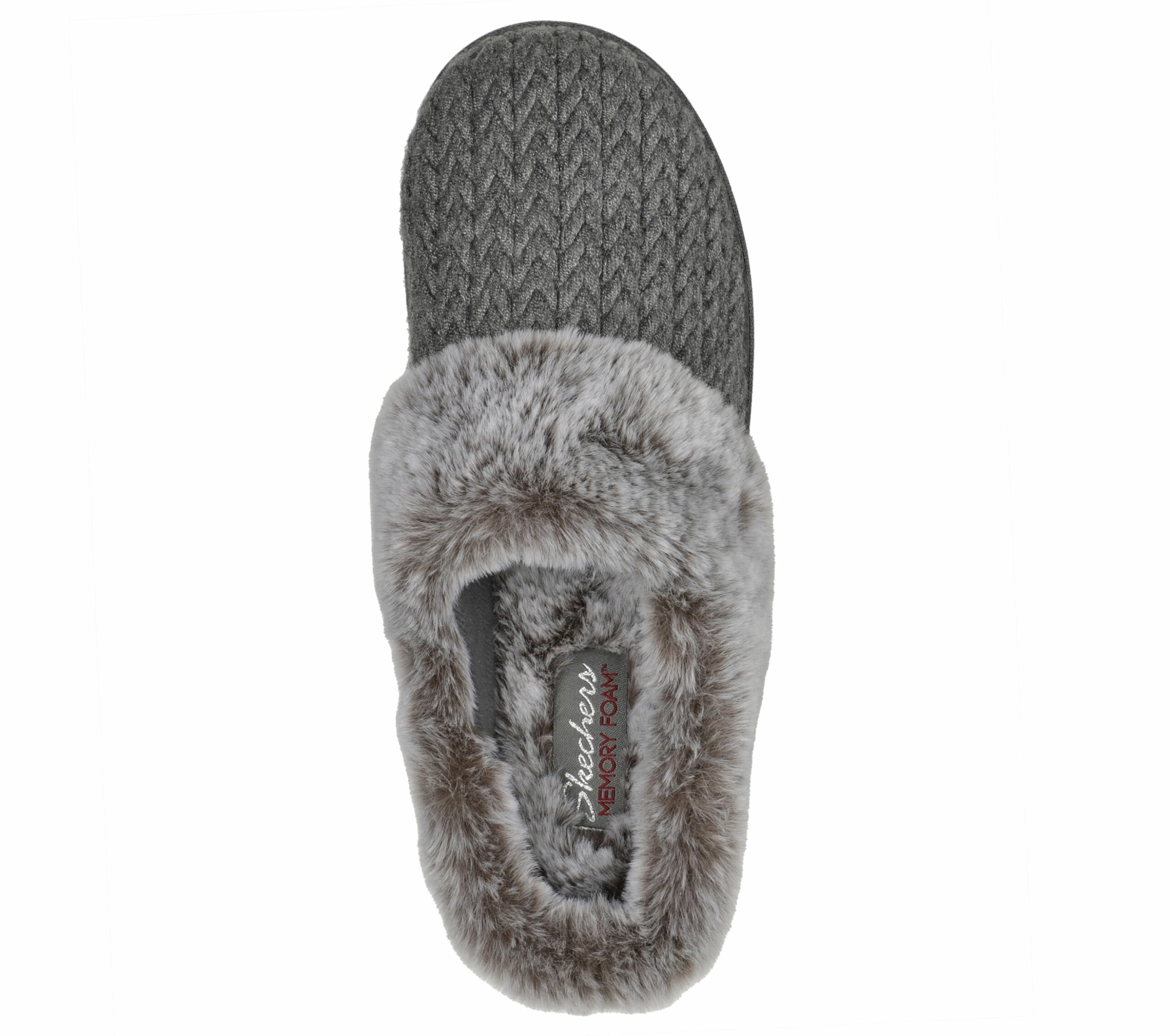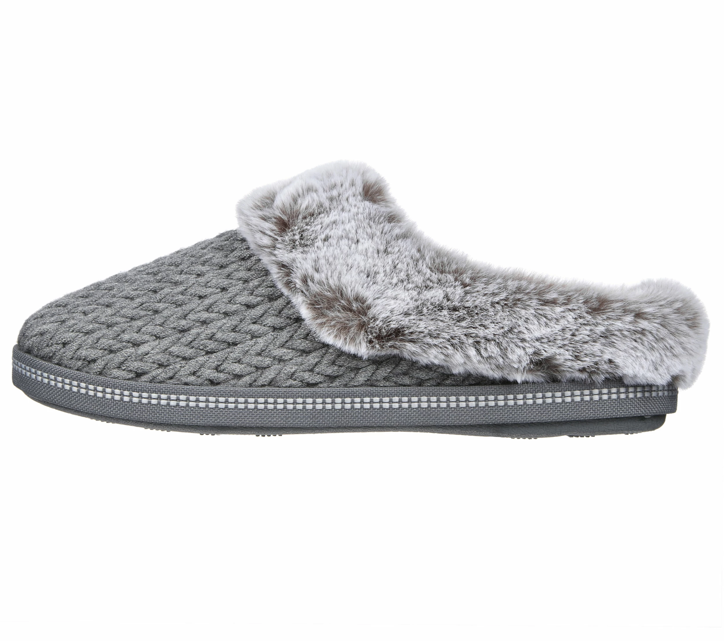 Enjoy laid-back cozy comfort all season long with Skechers Cozy Campfire – Cozy Times. This casual comfort slipper features a sweater knit upper in a chevron pattern with faux-fur trim and a cushioned Skechers Memory Foam comfort insole.