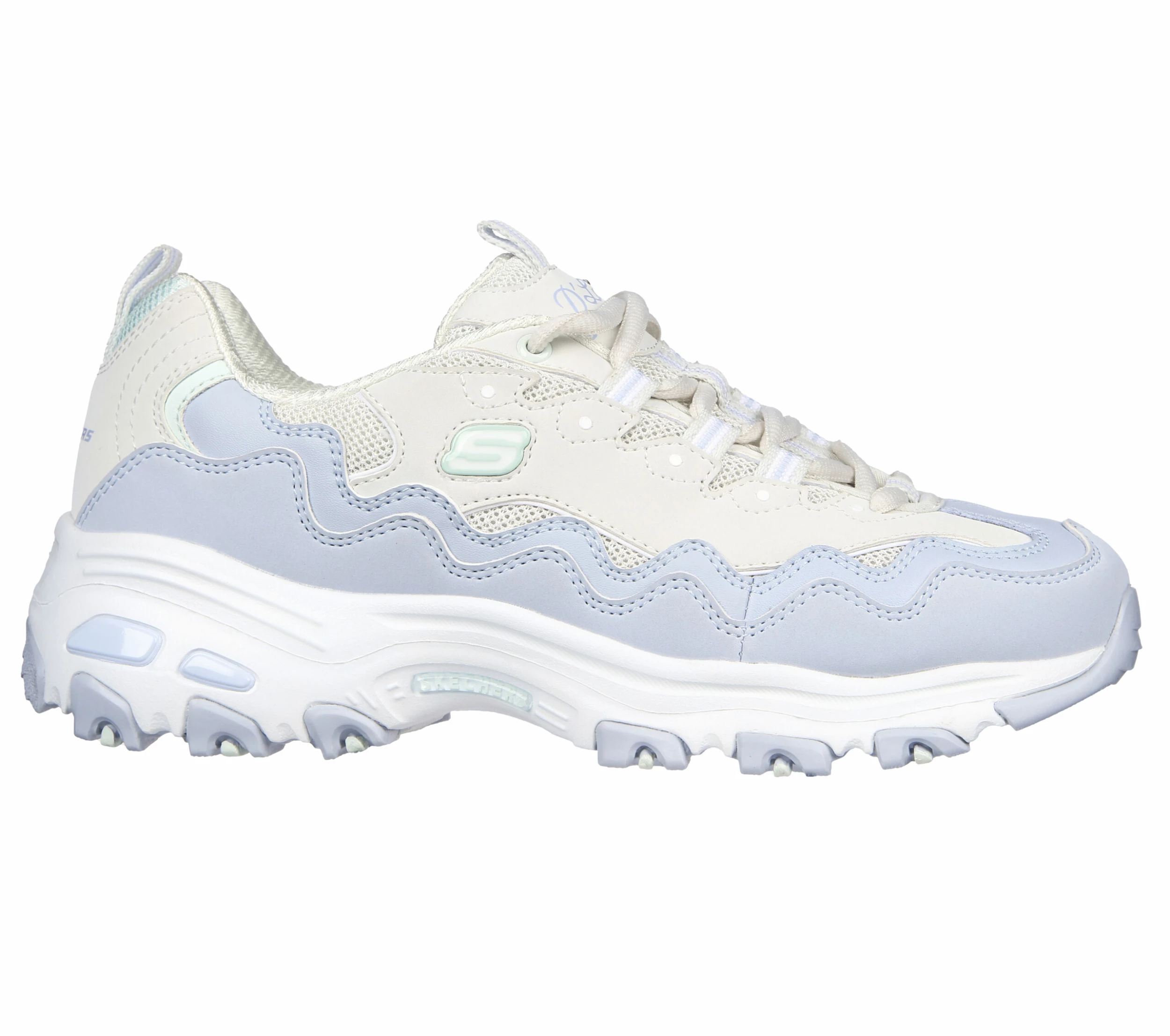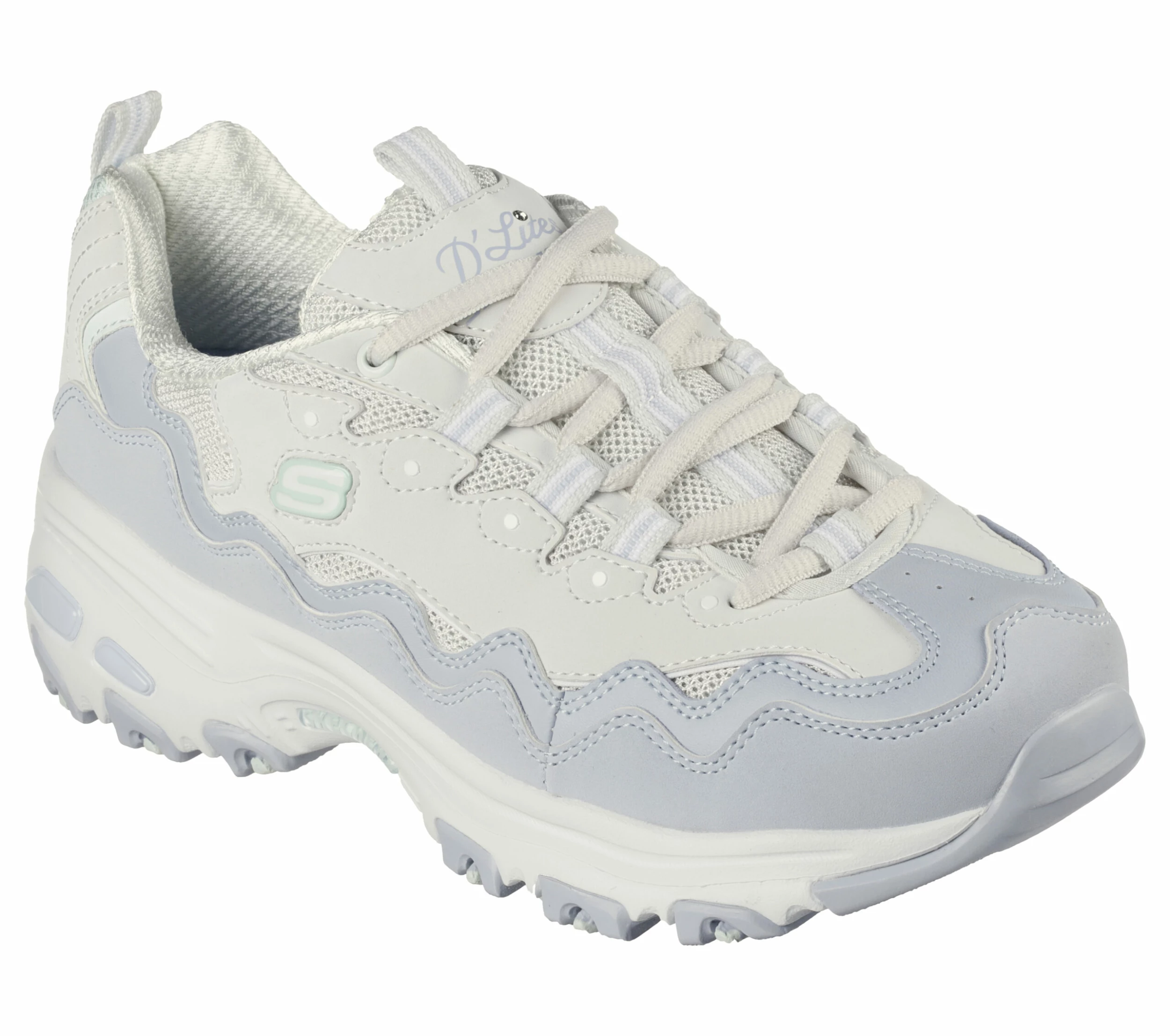 Roll along in fresh style and comfort wearing Skechers D’Lites® – Get Wavy. This lace-up fashion sneaker features a wavy multilayered synthetic and mesh upper, plus a cushioned Skechers Air-Cooled Memory Foam® insole.