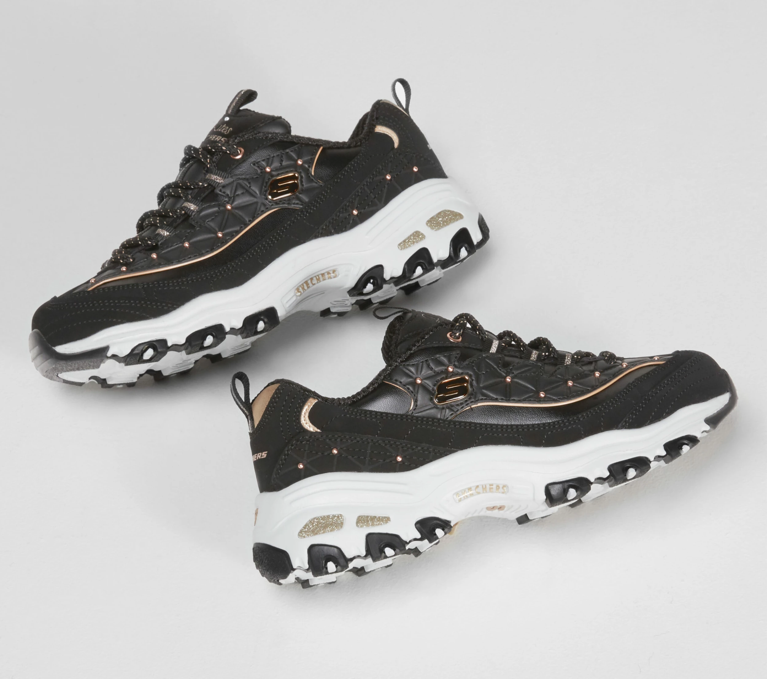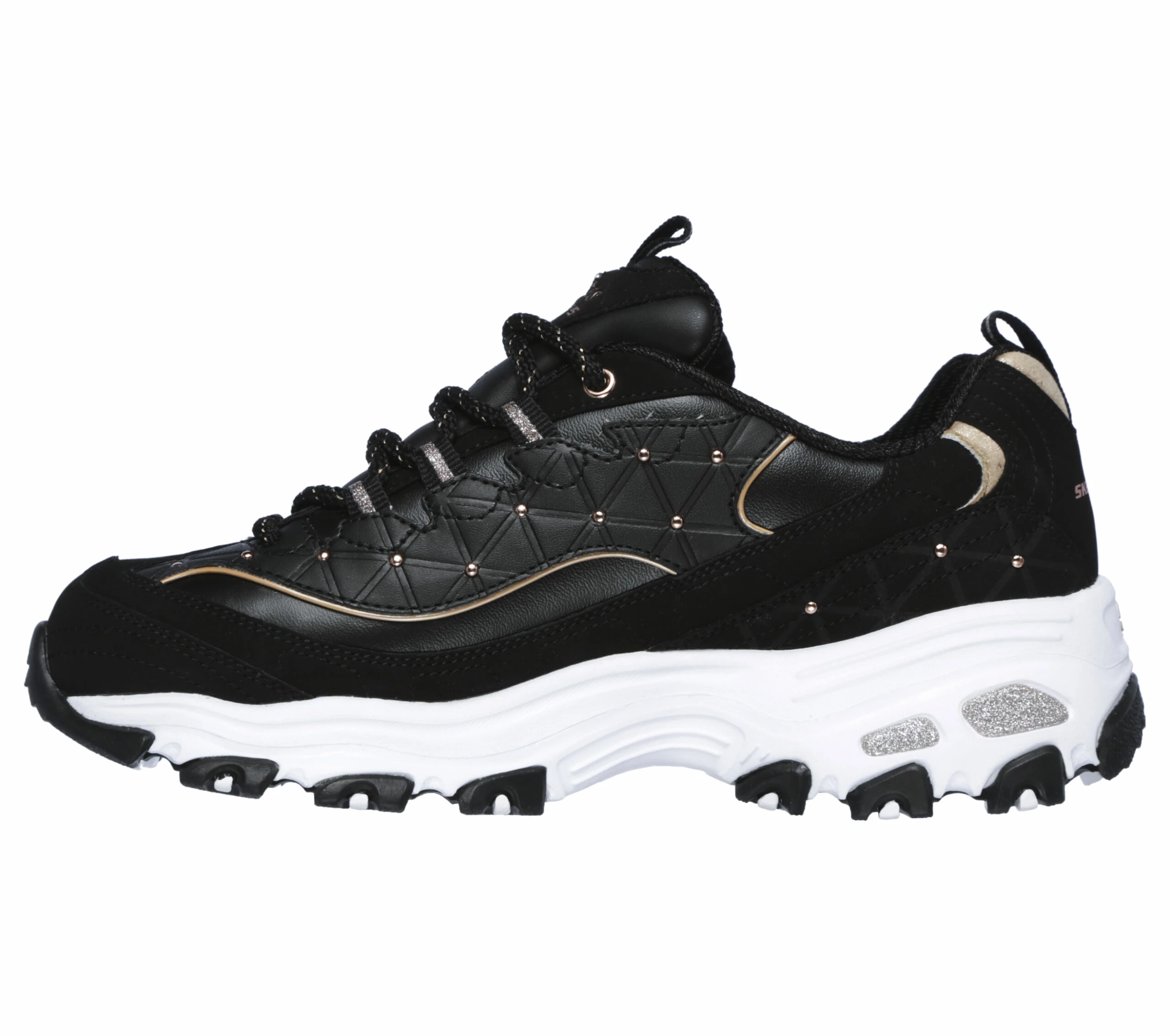 A popular classic sneaker style gets a fashionable new look with the SKECHERS D’Lites – Glamour Feels shoe. Smooth leather and metallic synthetic upper in a lace up sporty casual sneaker with stitching and overlay accents. Air Cooled Memory Foam insole.