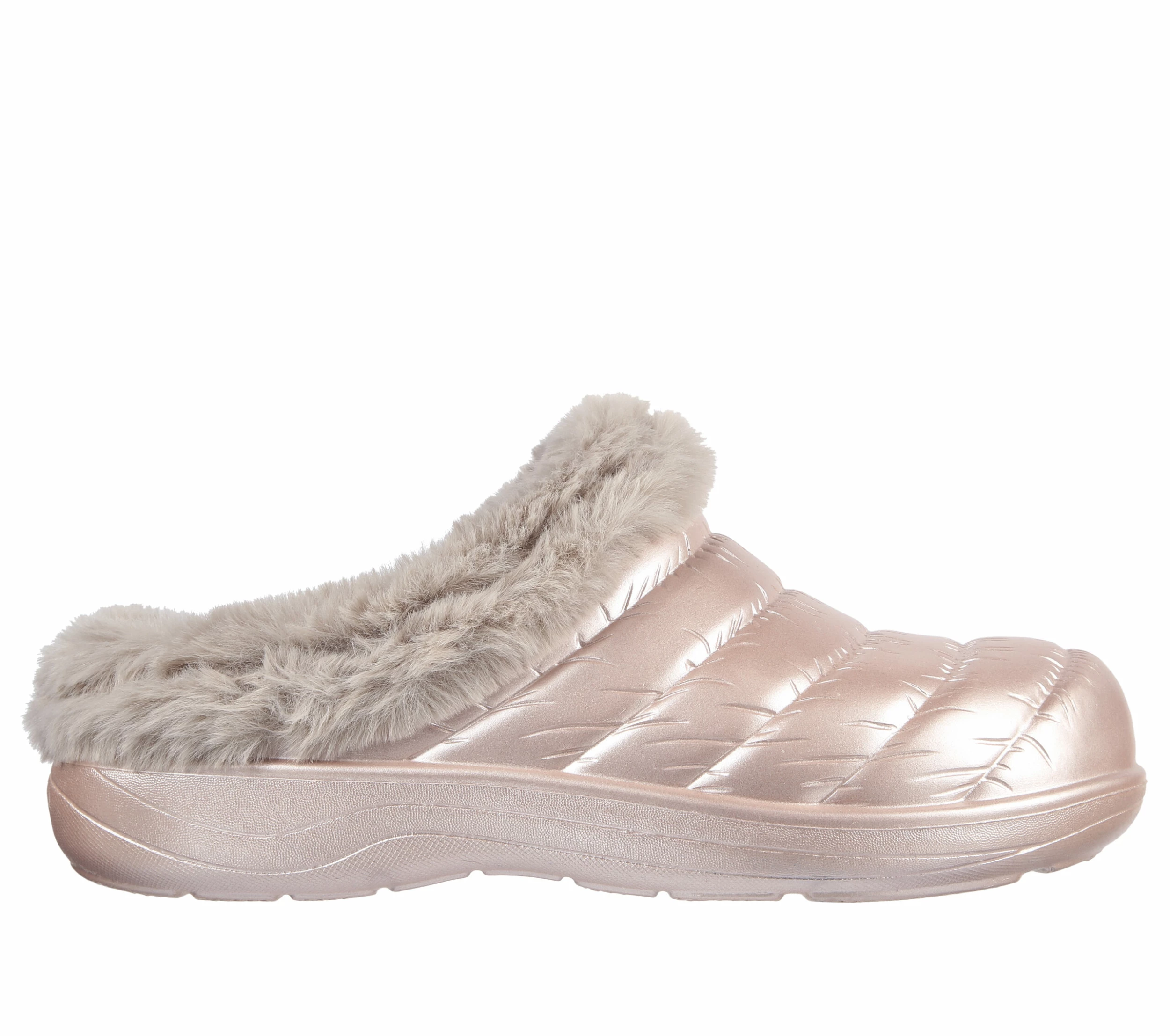 Add some fashionable detail to an easy comfort favorite with Skechers Foamies®: Cozy Camper – Glamping. This puffer sculpted comfort slip-on slipper clog features a flexible metallic finish EVA upper with a warm faux-fur trim and a contoured cushioned footbed.