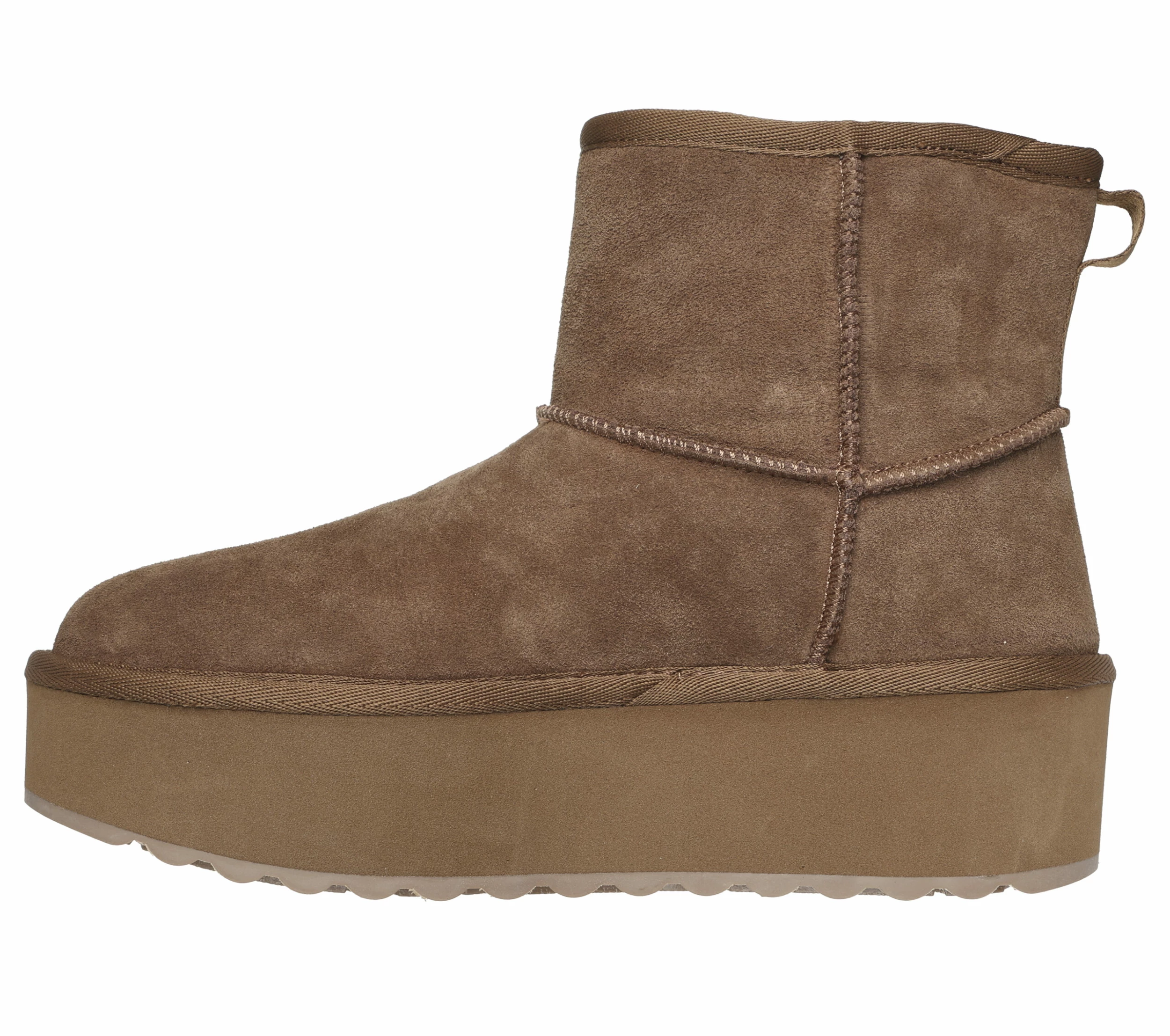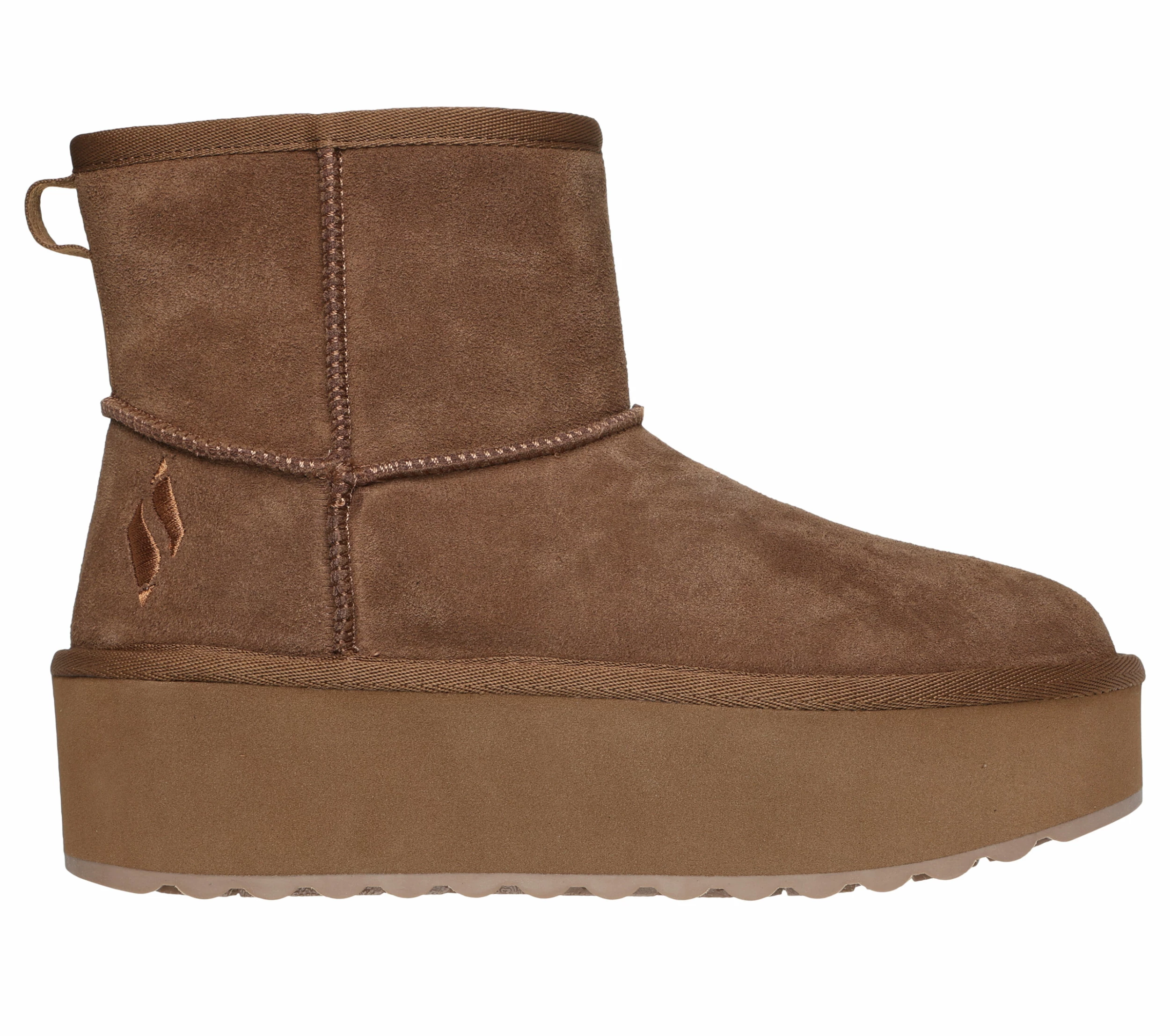 Raise the temps with new heights of style wearing Skechers Keepsakes Stacked. This platform cold-weather pull-on boot features a 3M® Scotchgard® treated suede leather upper with faux shearling lining and a cushioned Warm Tech Memory Foam insole.