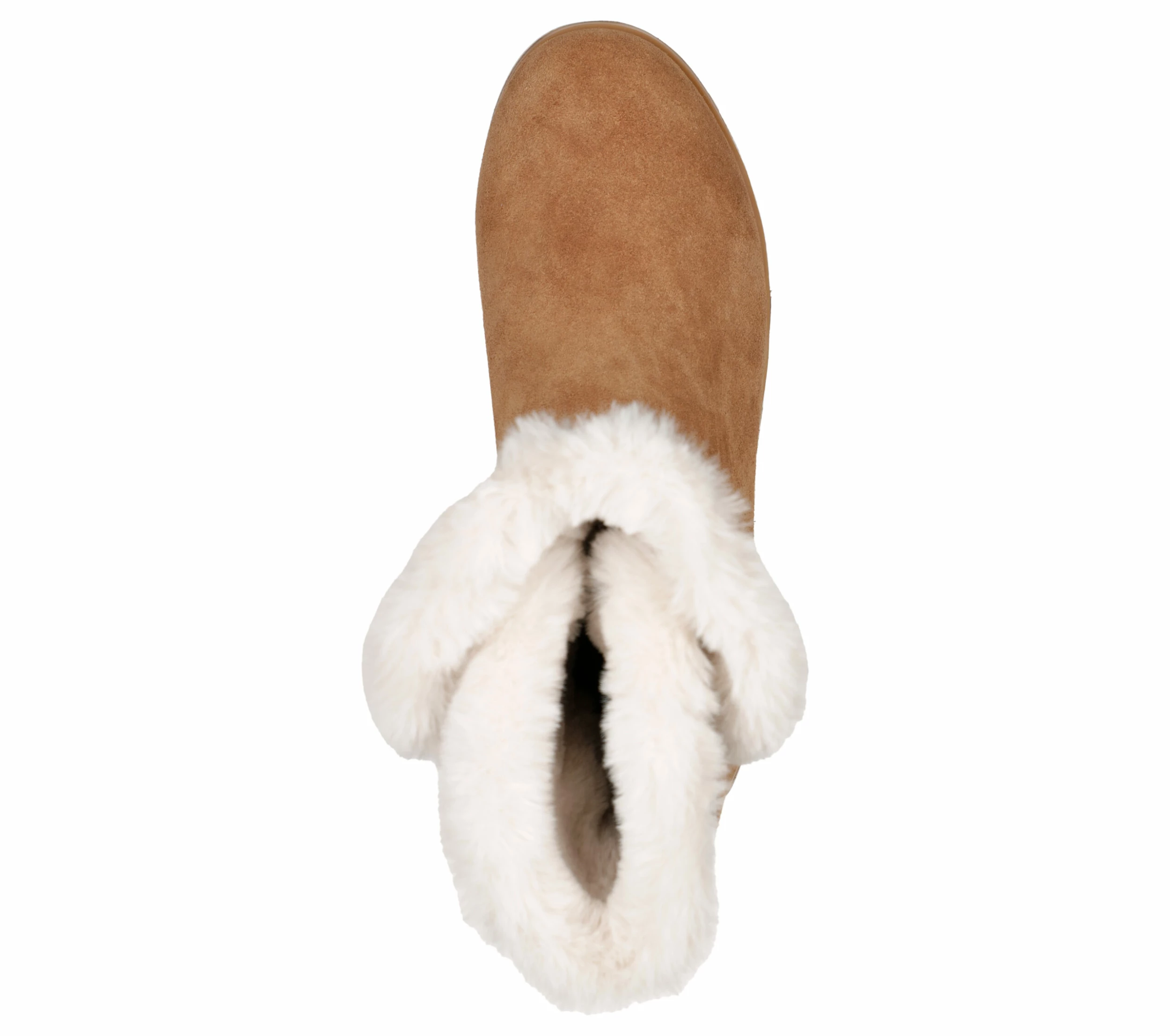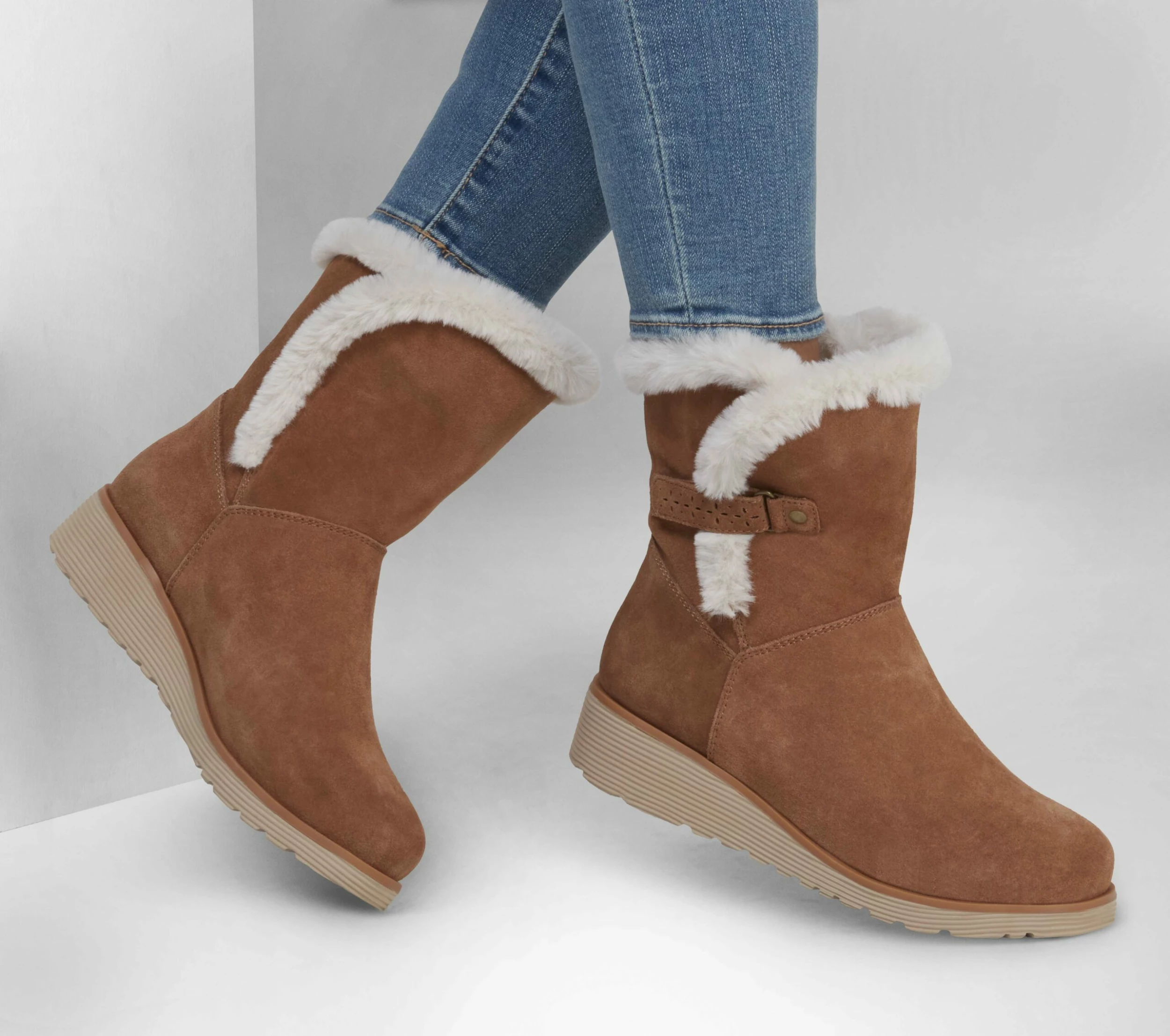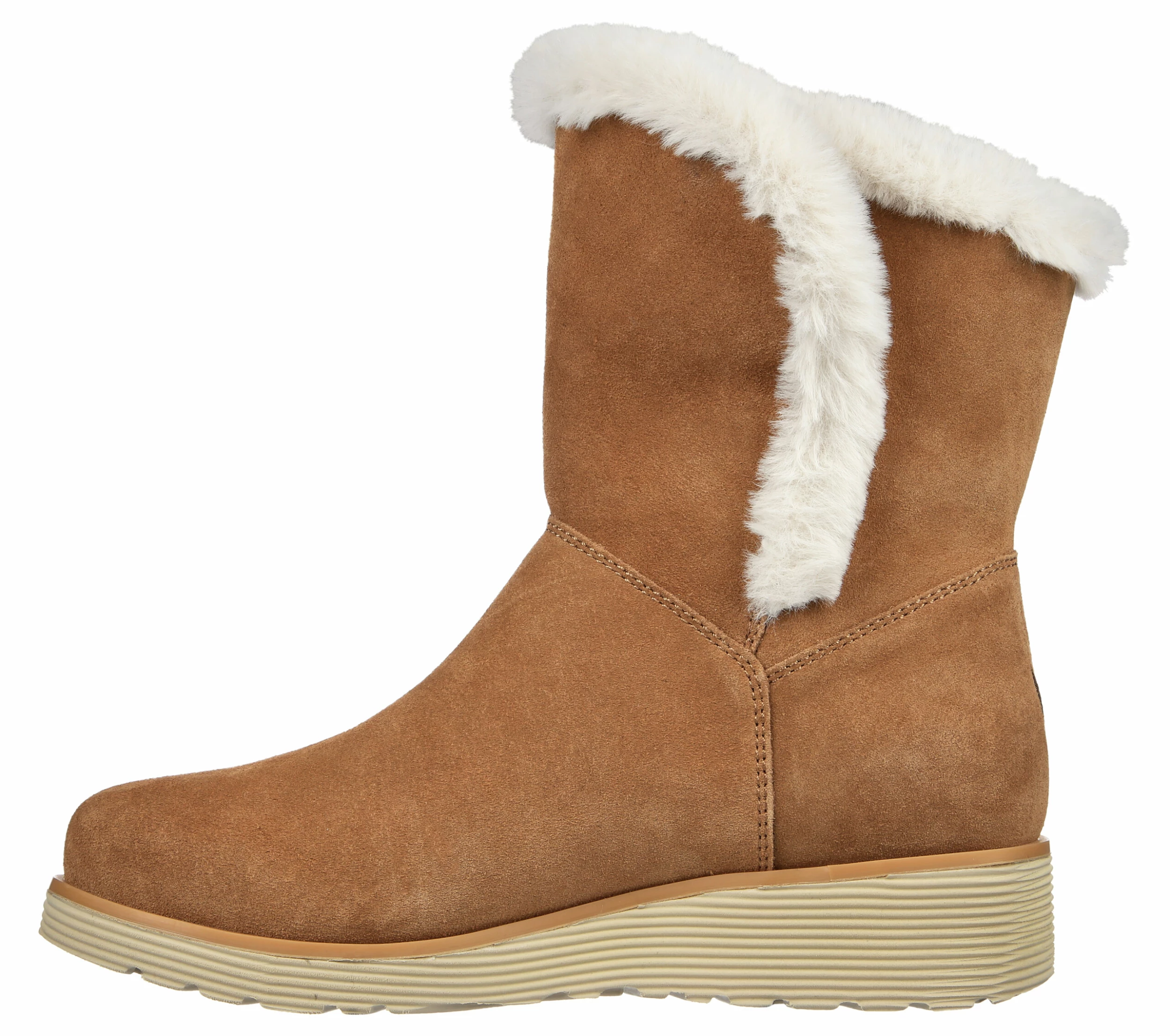 Step into cozy comfort this season in Skechers Keepsakes Wedge – Major Moments. This casual cold-weather boot features a soft suede upper with a faux-fur trim, pull-on style and a cushioned Warm Tech Memory Foam insole.