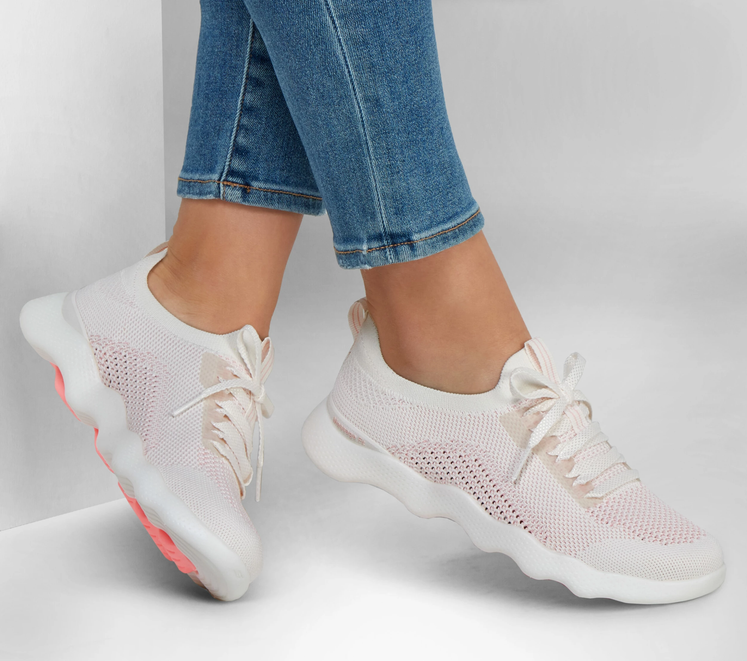 Enhance your daily walks with waves of comfort wearing Skechers Massage Fit Lite – Entice. This innovative design features a two toned Stretch Fit® mesh upper with deco laces, lightweight HYPER BURST® cushioning, and a gently massaging midsole.