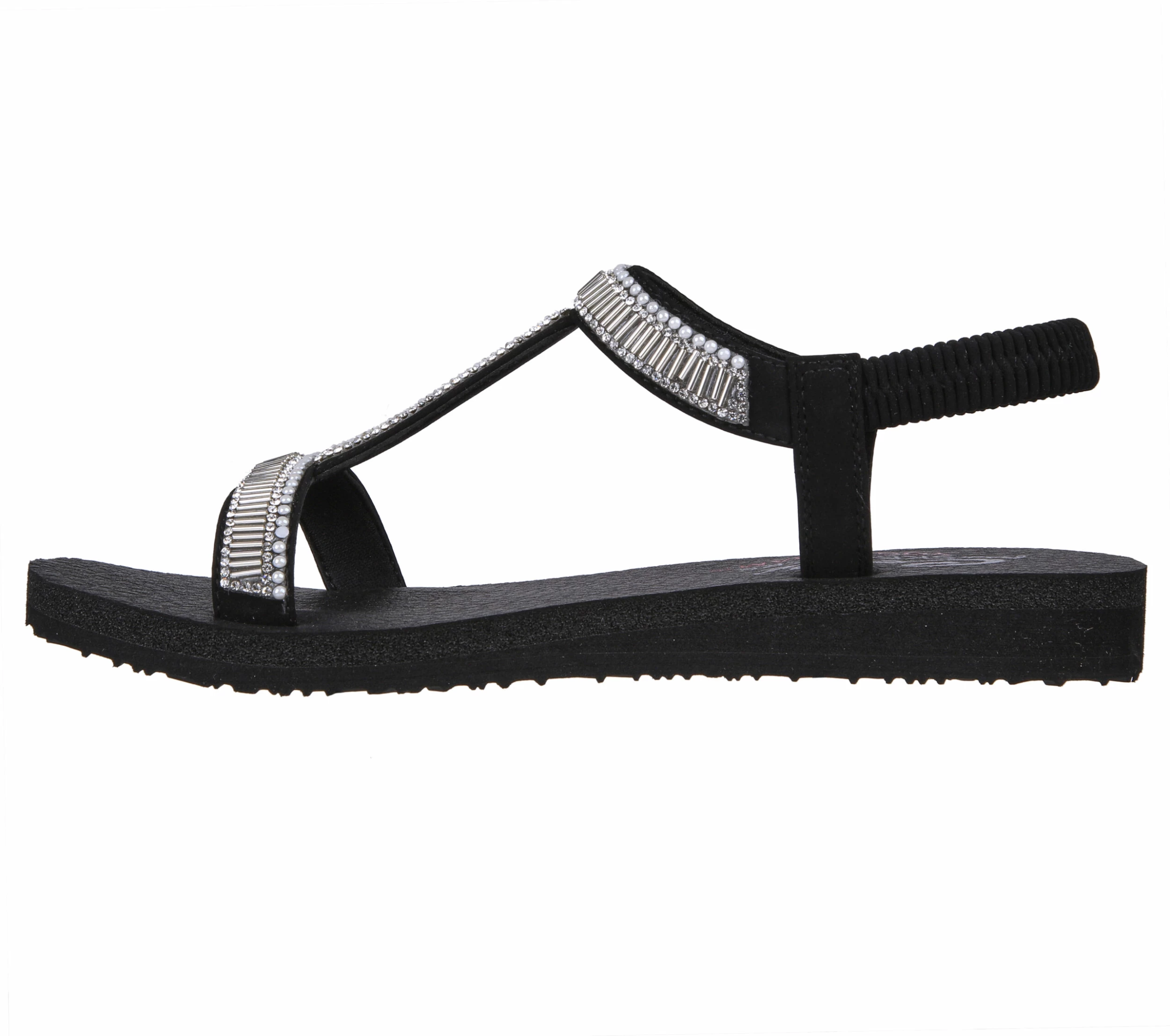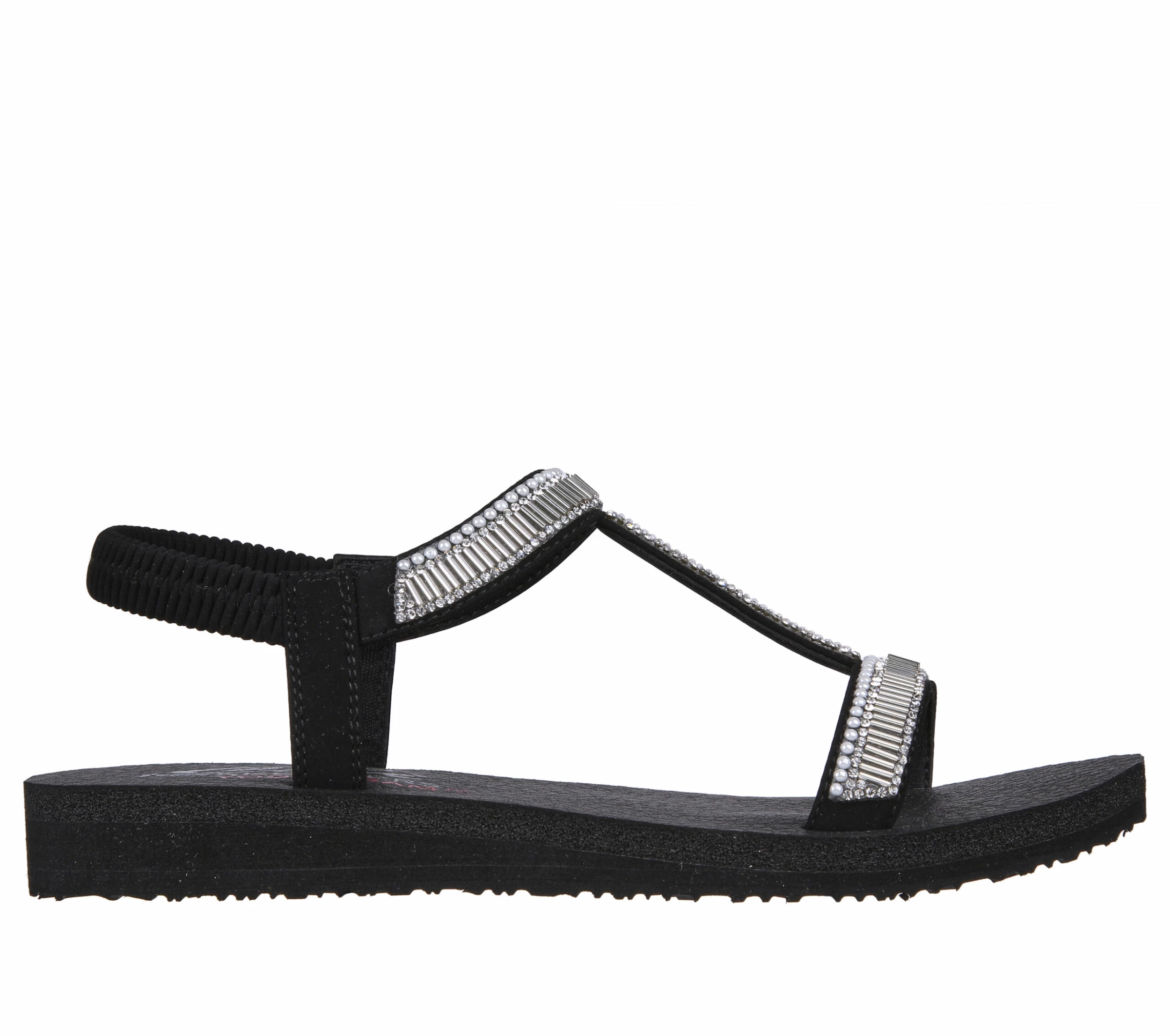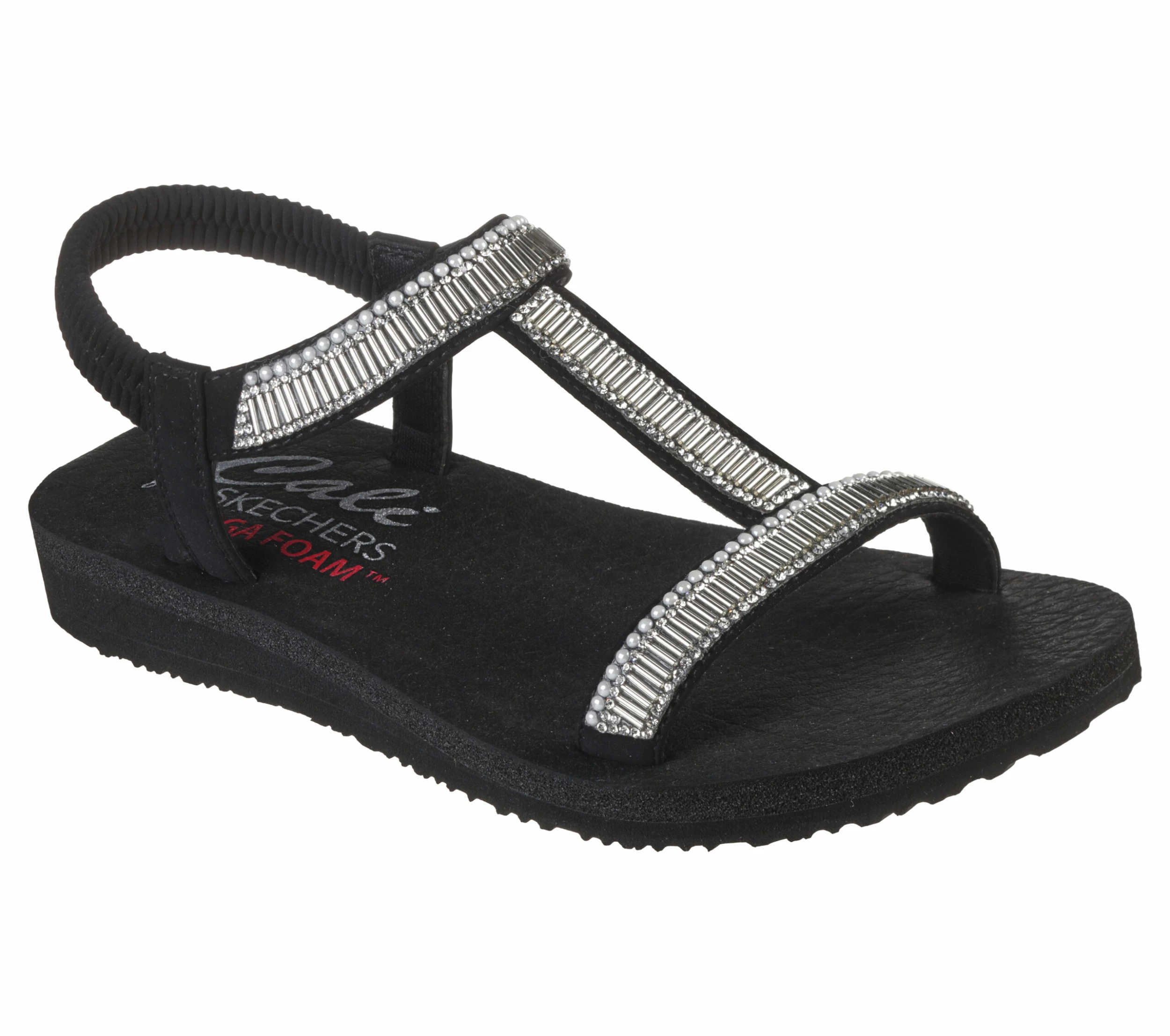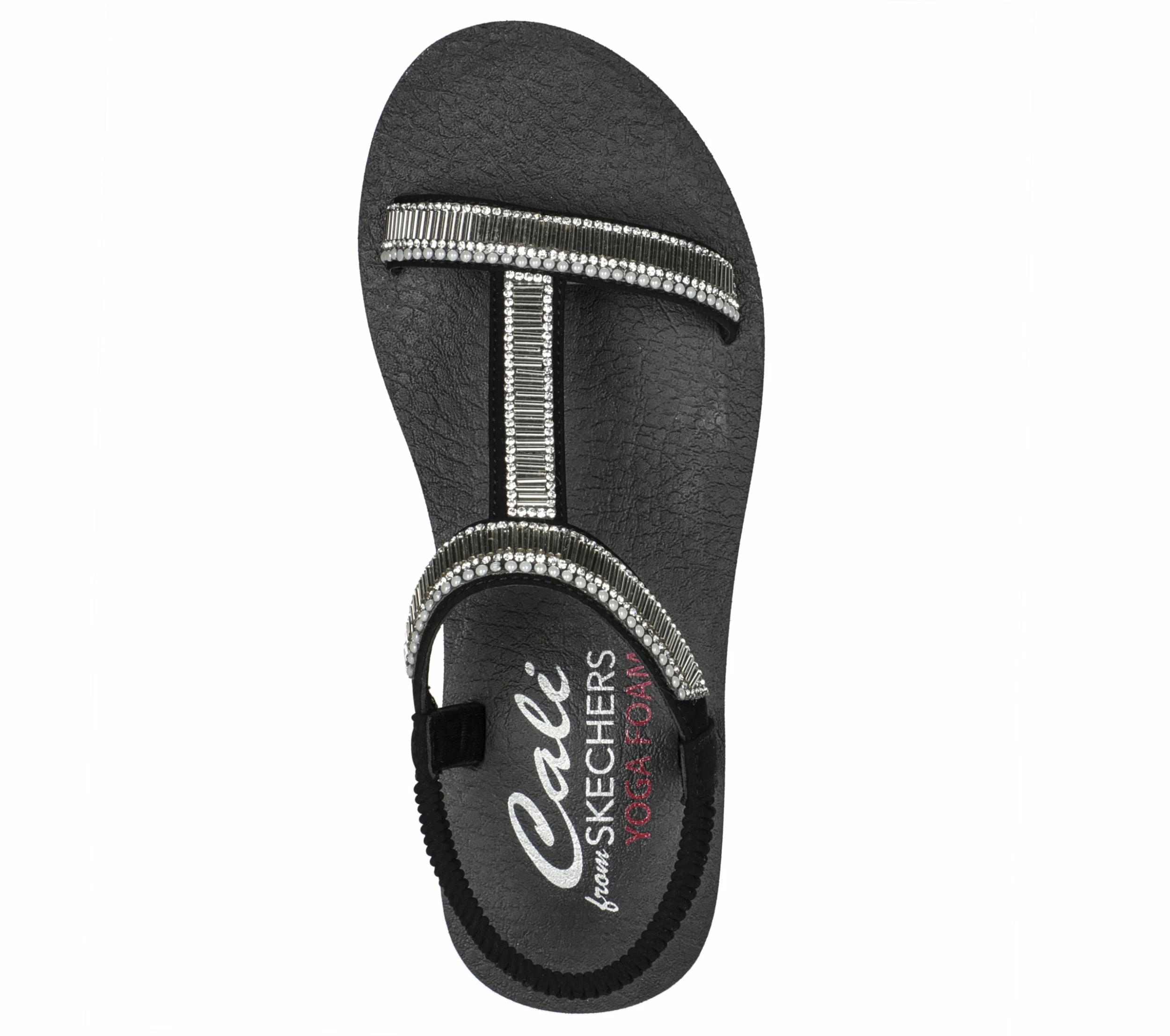 Dazzle them with summery shimmer in Skechers Cali® Meditation – Bead Please! This slip-on T-strap style sandal features a synthetic upper with pearl and rhinestone embellishments, plus a Yoga Foam comfort footbed.