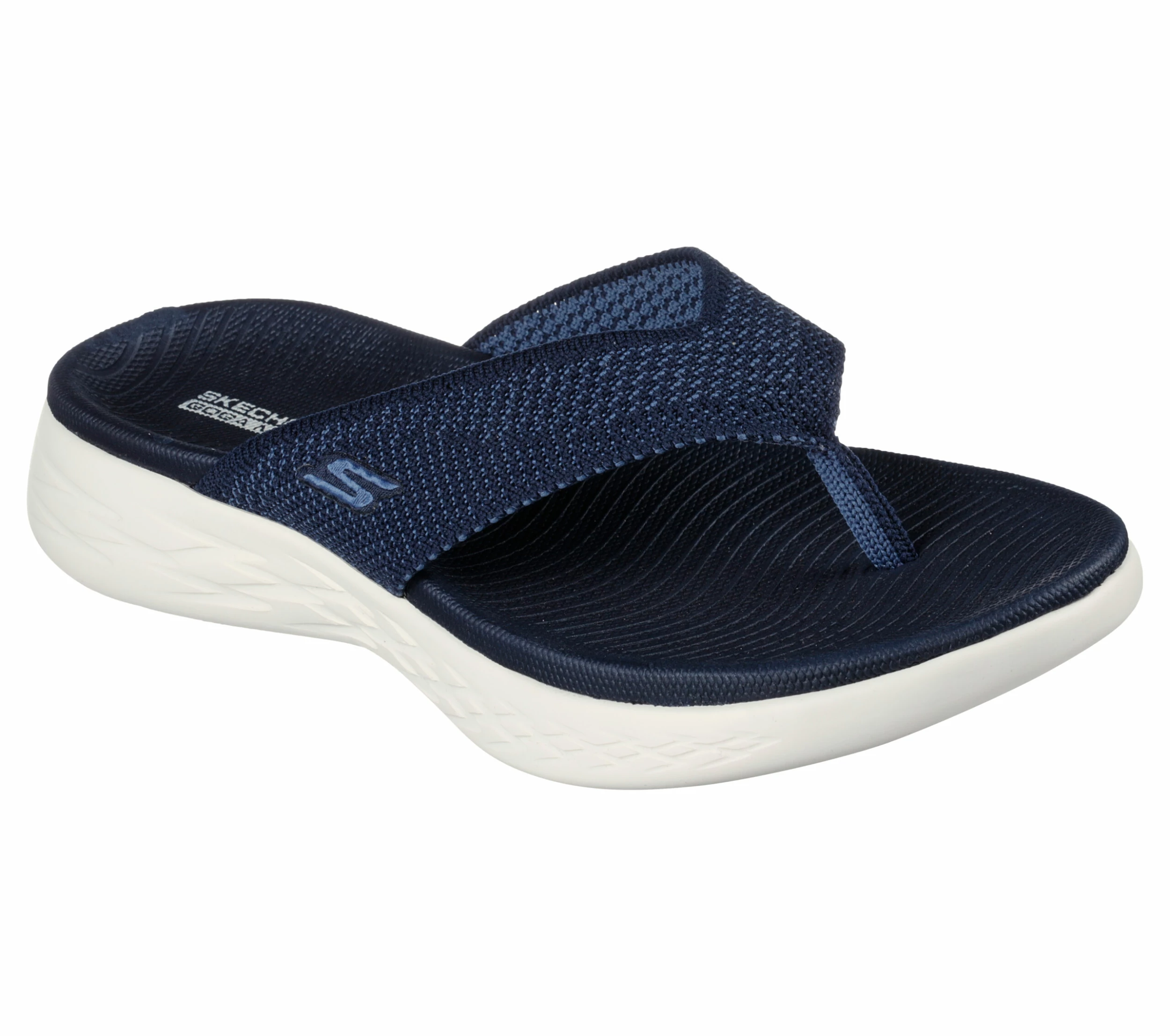 Walk with warm-weather style and comfort wearing Skechers On-the-GO® 600 – Flourish. This sporty 3-point thong sandal features a soft two-toned woven mesh upper, supportive contoured Goga Mat® footbed design and lightweight 5GEN® cushioning.