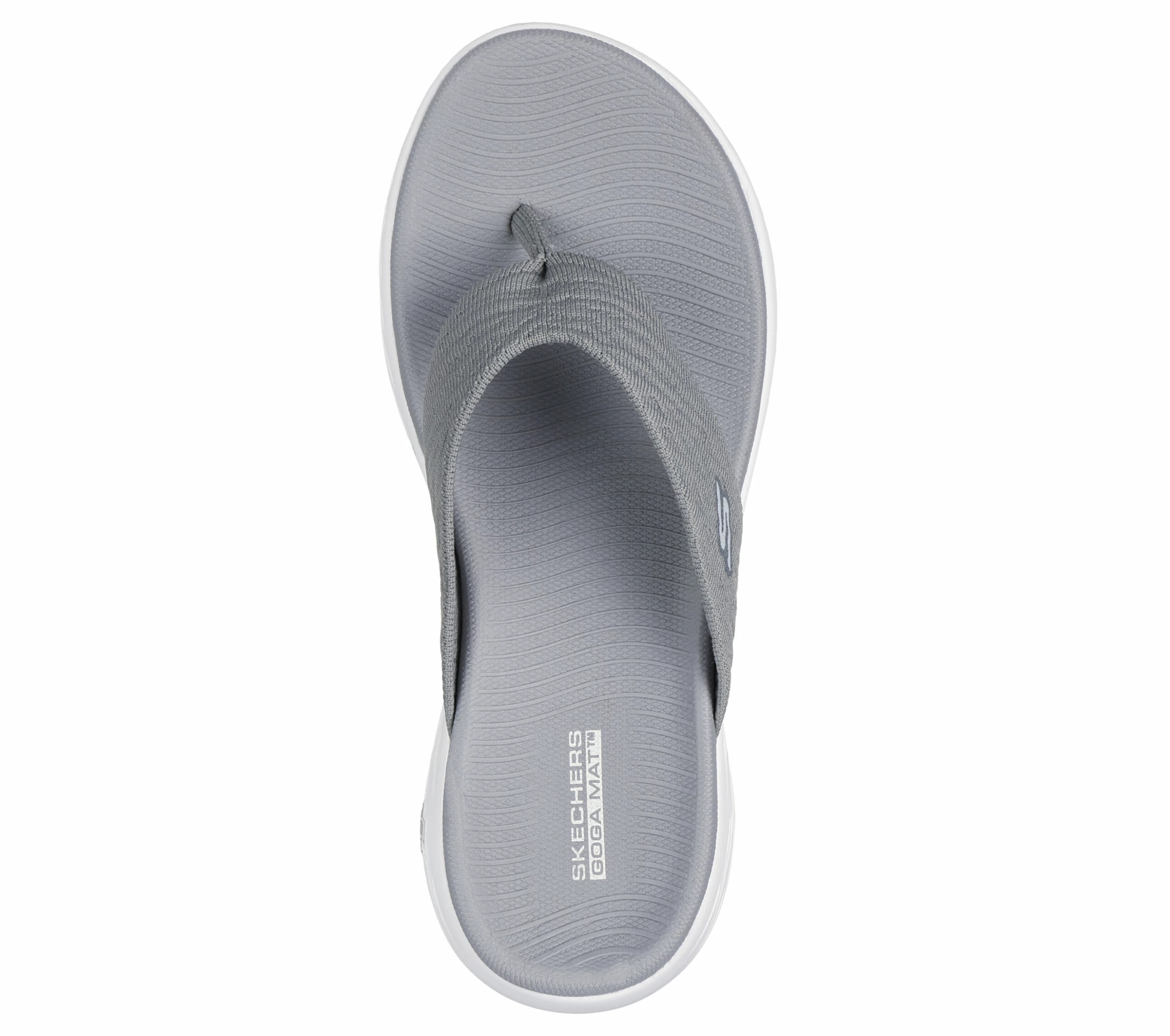 Walk with warm-weather style and comfort wearing Skechers On-the-GO 600 – Sunny. This sporty 3-point thong sandal features a soft woven mesh upper, supportive contoured Goga Mat® footbed design, lightweight 5GEN® cushioning and a GO RUN® 600 outsole design.