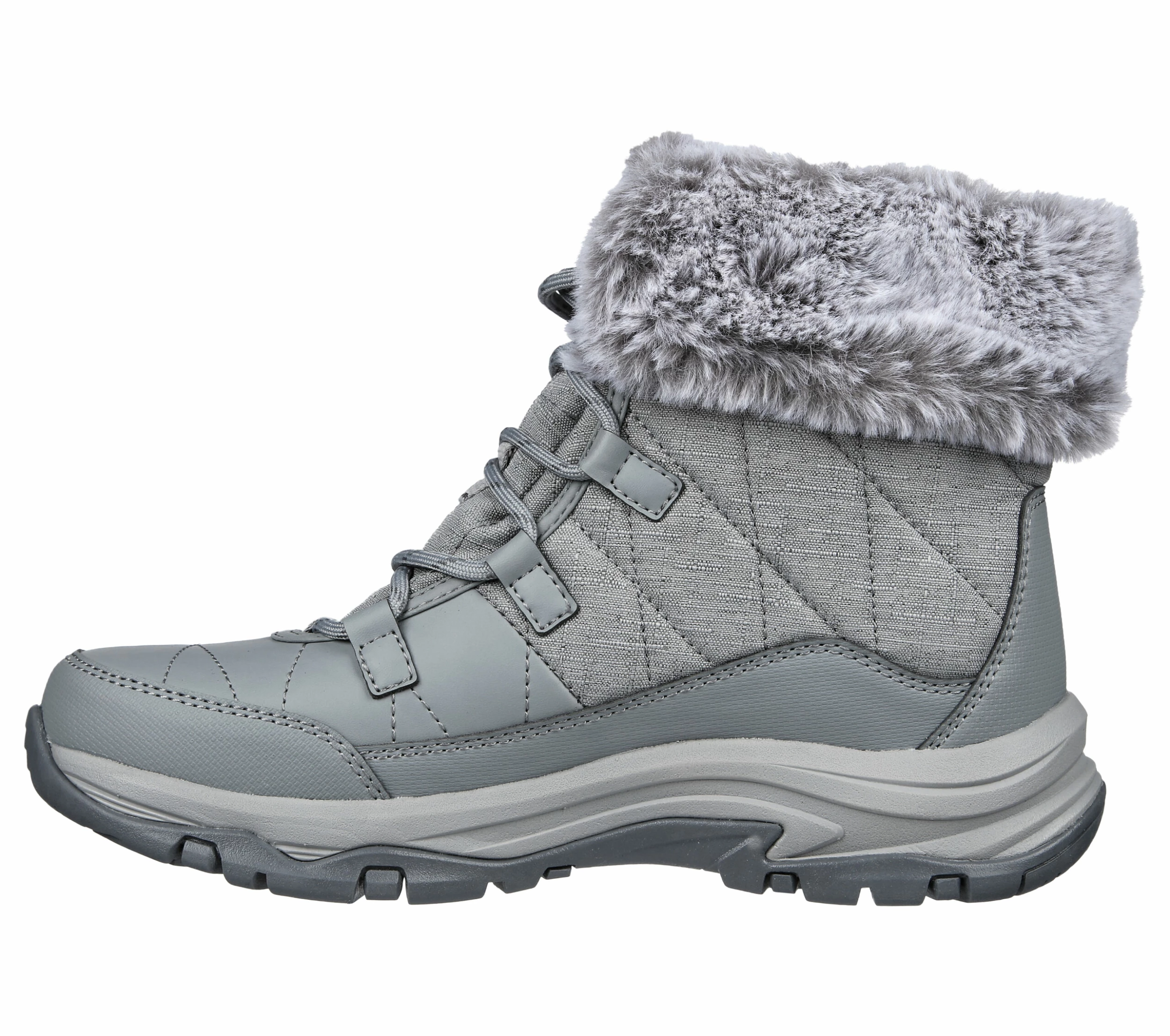 Take the winter on in stylish comfort with Skechers Relaxed Fit®: Trego – Winter Feelings. This waterproof lace-up winter trail boot features a quilted jersey and synthetic upper, faux-fur fold over collar and lining, plus a cushioned Skechers Air-Cooled Memory Foam® insole.