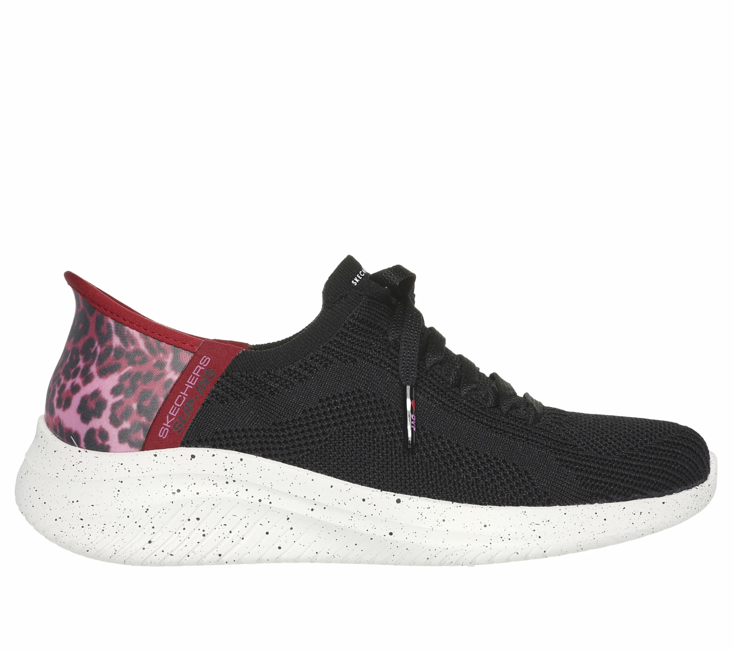 Legendary fashion designer Diane von Furstenberg brings her celebrated prints to Skechers in this limited-edition collaboration. Show your love for DVF wearing Skechers Hands Free Slip-ins® x Diane von Furstenberg: Ultra Flex 3.0 – Feline Stretch. This vegan athletic style features a sparkle knit Stretch Fit® upper with deco laces, super flexible speckled midsole, leopard print Skechers Slip-ins® molded heel panel, plus a cushioned Air-Cooled Memory Foam® insole.