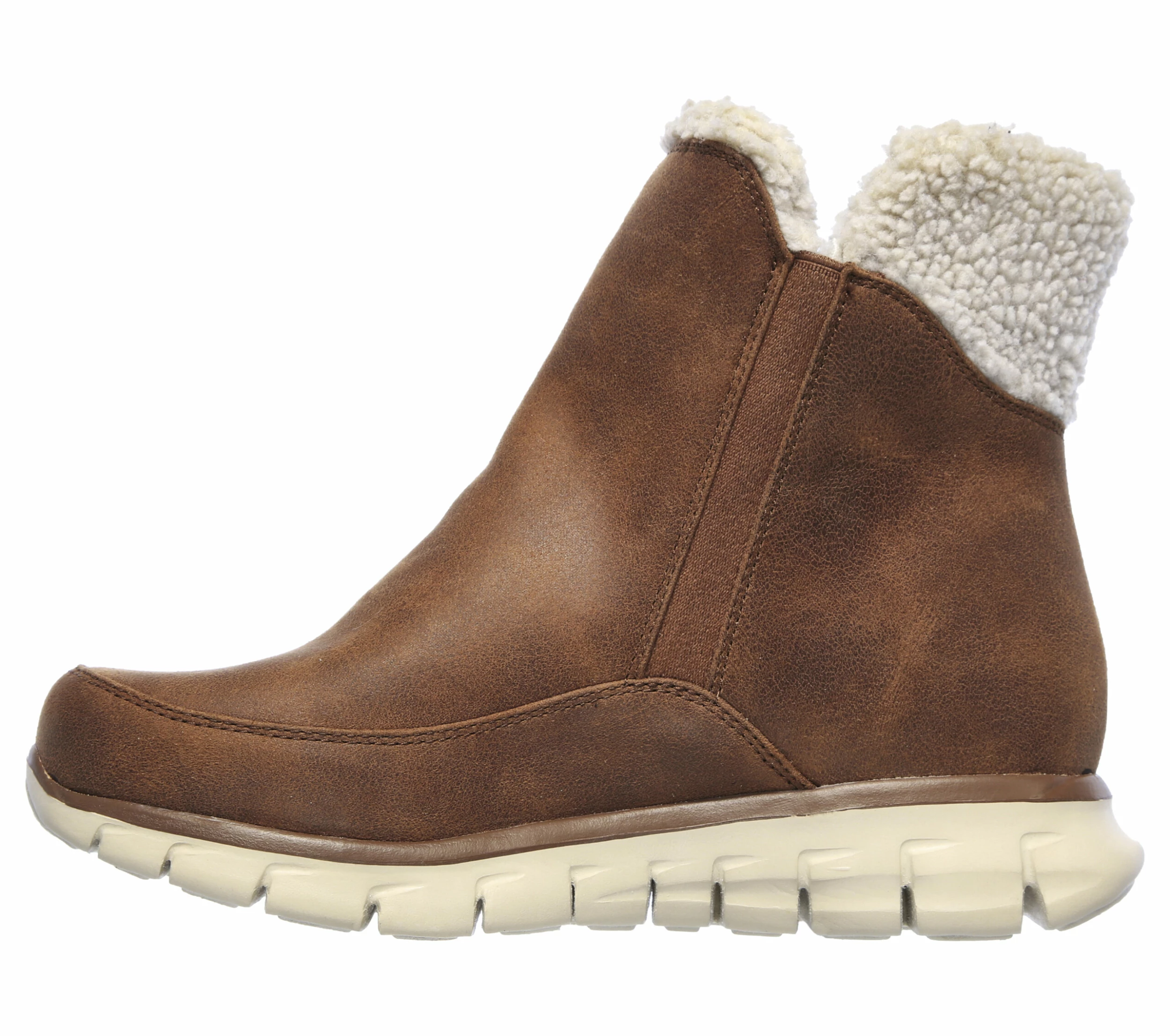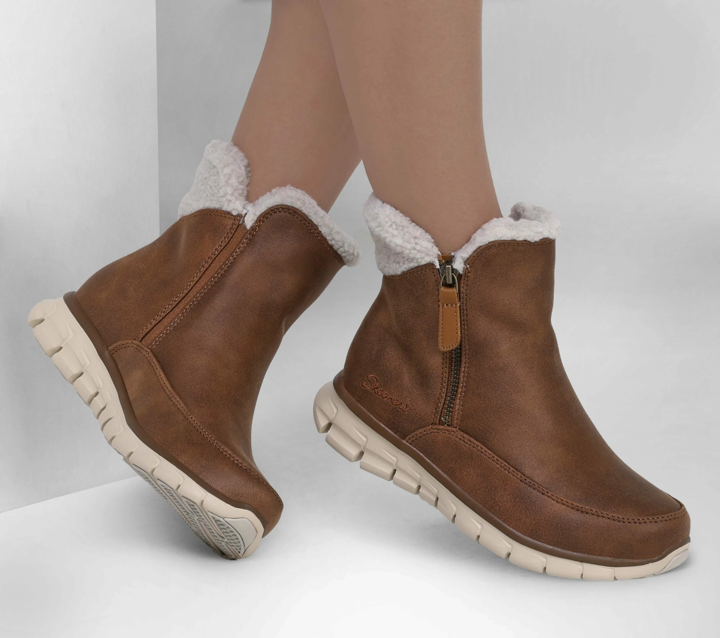 Find a great balance of sporty lightweight comfort and seasonal casual style in Skechers Synergy – Collab. This winter boot features a smooth micro leather fabric and faux sherpa upper with a Warm Tech Memory Foam insole, zip closure and a slip-resistant outsole.