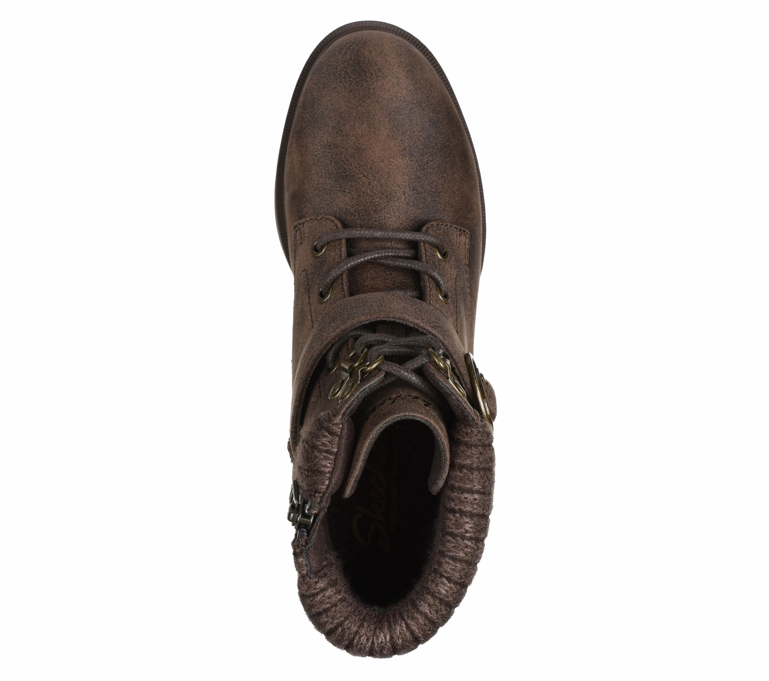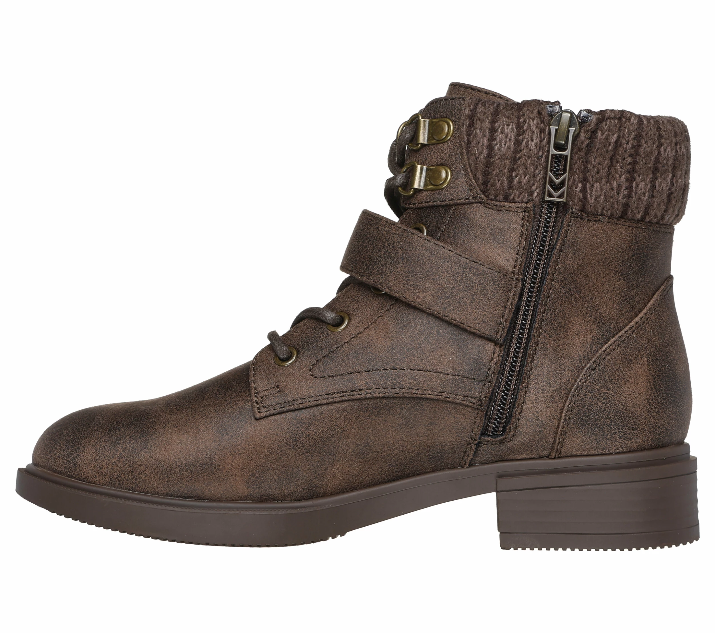 Style and cozy comfort combine in Skechers Tenley – Dreaming Of Fall. Featuring a lace-up vegan leather upper with a sweater knit trim, buckle accent, side zip closure, and a cushioned Skechers Air-Cooled Memory Foam® insole.