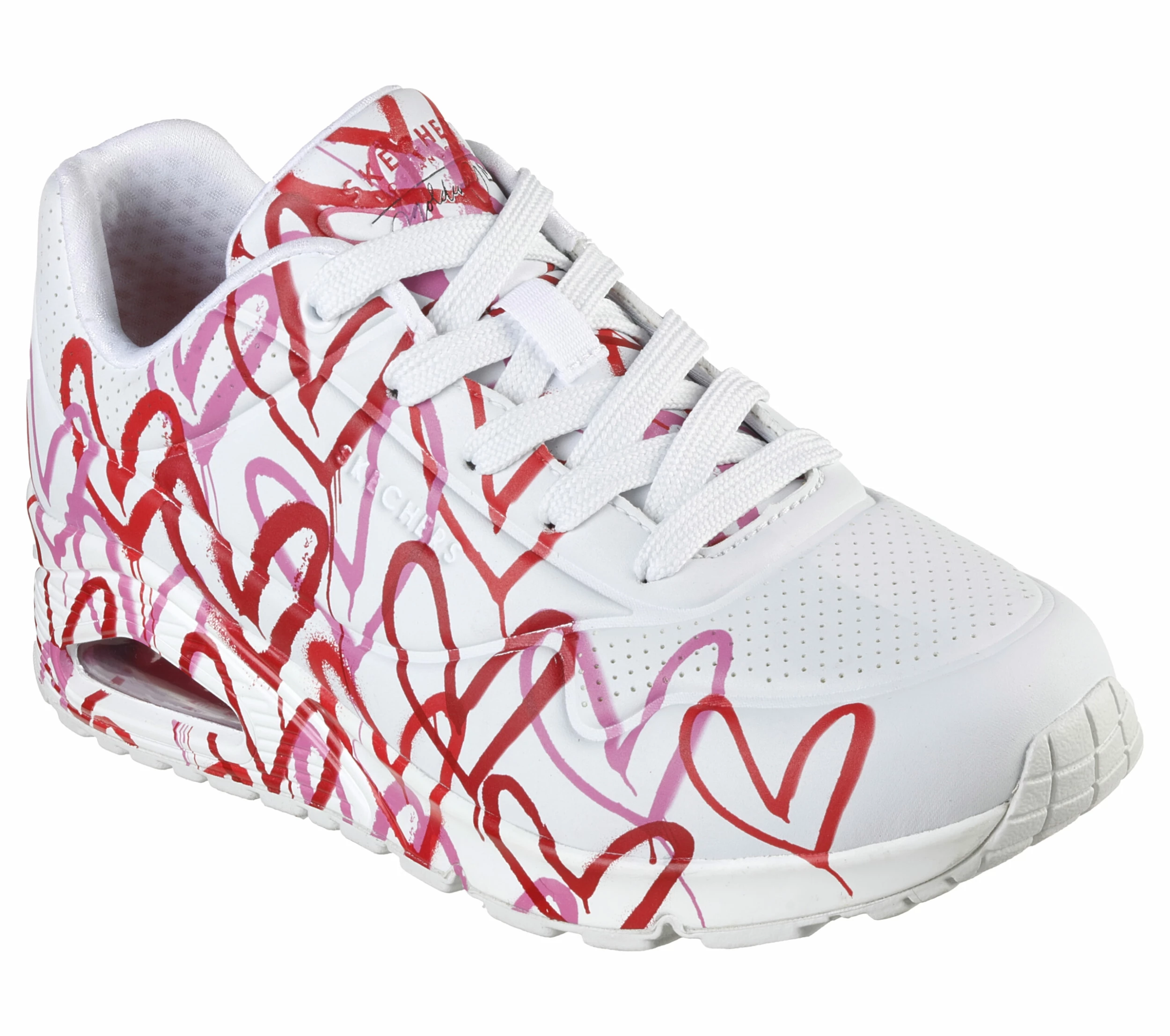 Internationally renowned muralist James Goldcrown brings his iconic #Lovewall heart designs to Skechers in this inspiring collaboration. Show your creative style with the Skechers x JGoldcrown: Skechers Street Uno – Spread the Love. This lace-up fashion sneaker features an allover print of the artist’s signature heart design that extends to the outsole, synthetic durabuck and perforated trimmed upper with a Skechers Air-Cooled Memory Foam® insole, and a platform wedge with visible Skech-Air® air-cushioned midsole.